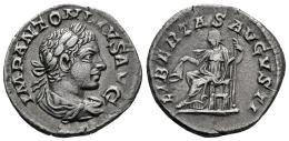 Elagabalus. Denarius. 219-220 AD. Rome. (Ric-IV 115). (Bmcre-151). (Rsc-101a). Anv.: IMP ANTONINVS AVG, laureate and draped bust to right. Rev.: LIBERTAS AVGVSTI, Libertas seated to left, holding pileus and sceptre. Ag. 3,07 g. Slight patina. Choice VF/VF. Est...90,00.