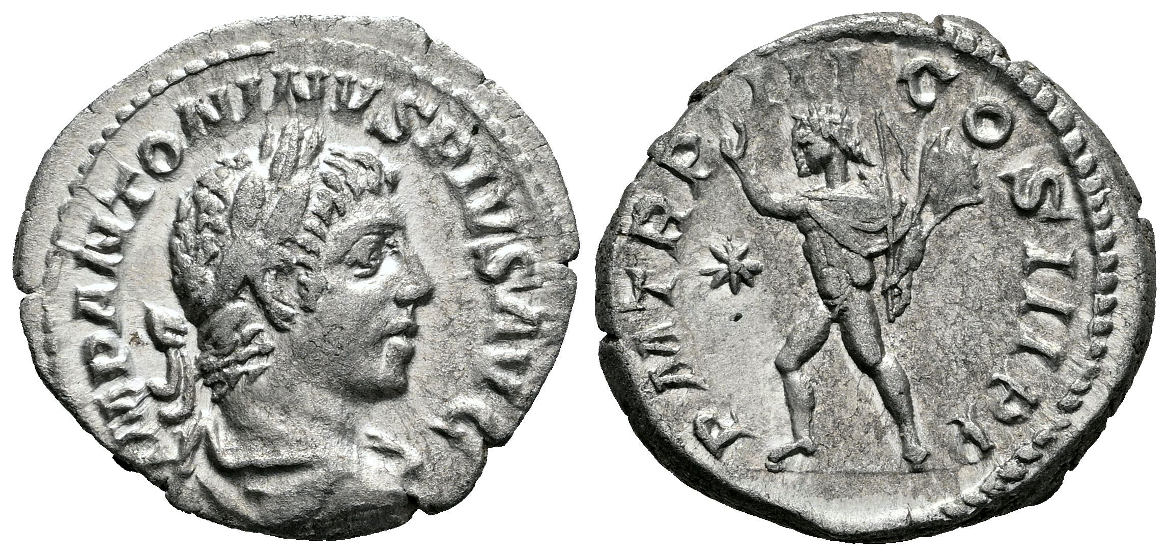 Elagabalus. Denarius. 220 AD. Rome. (Ric-IV 28). (Bmcre-179). (Rsc-154). Anv.: IMP ANTONINVS PIVS AVG, laureate and draped bust to right. Rev.: P M TR P III COS III P P, Sol advancing to left, raising hand and holding whip; star in left field. Ag. 3,36 g. Choice VF. Est...80,00.