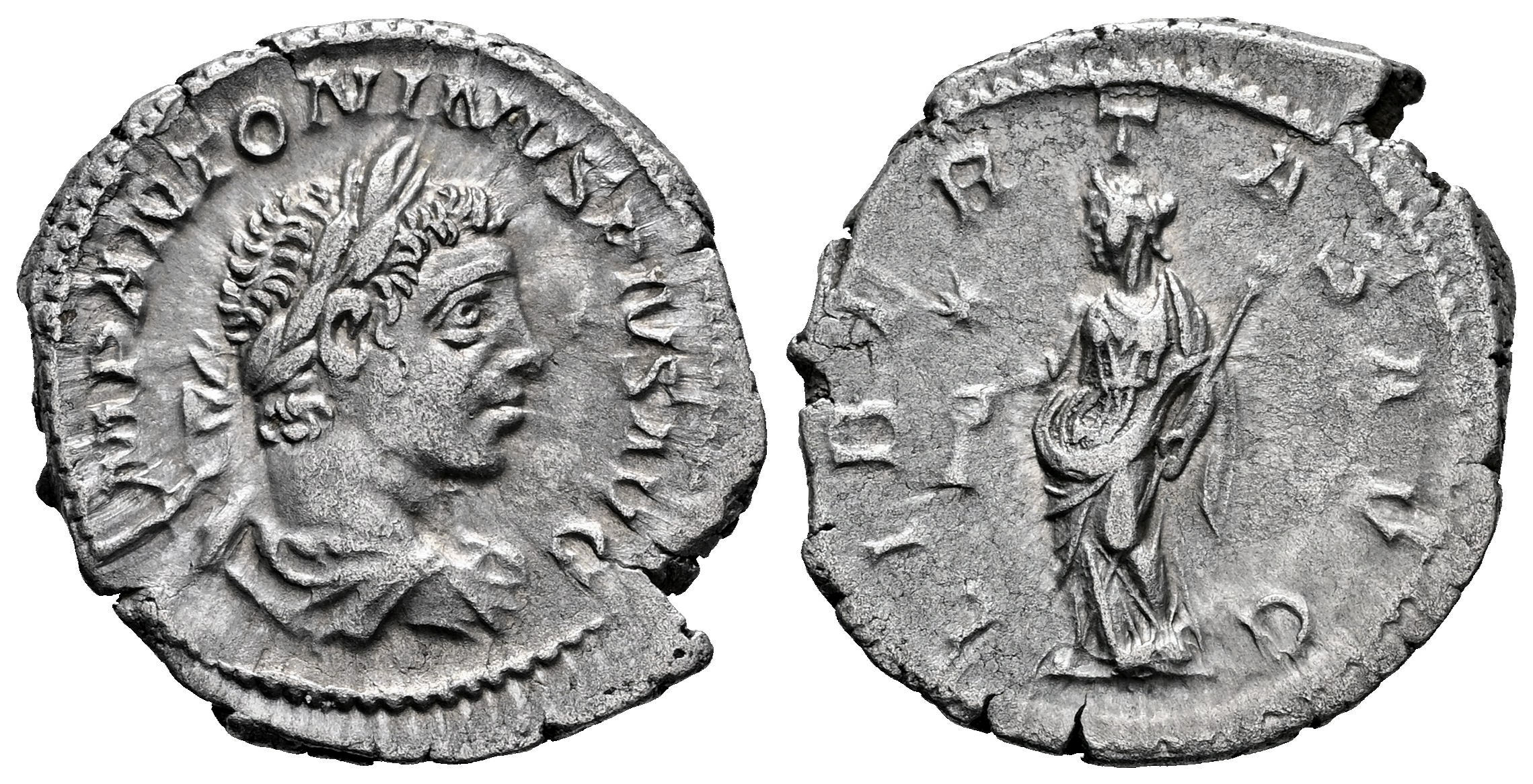 Elagabalus. Denarius. 220-222 AD. Rome. (Ric-IV 107). (Bmcre-222). (Rsc-92a). Anv.: IMP ANTONINVS PIVS AVG, laureate and draped bust to right. Rev.: LIBERTAS AVG, Libertas standing to left, holding pileus and sceptre; star in left field. Ag. 3,30 g. Ex Cayón (06/02/2009), lot 6569. Choice VF. Est...80,00.