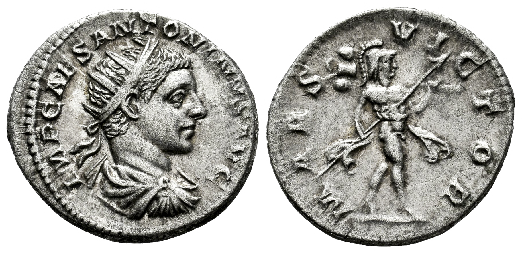 Elagabalus. Antoninianus. 219 AD. Rome. (Ric-IV 120). (Bmcre-111). Anv.: IMP CAES ANTONINVS AVG. Radiate, draped and cuirassed bust to right, seen from behind. Rev.: MARS VICTOR. Mars advancing right, holding spear in his right hand and trophy over his left shoulder. Ag. 4,95 g. Hairlines on reverse. Almost XF/Choice VF. Est...90,00.