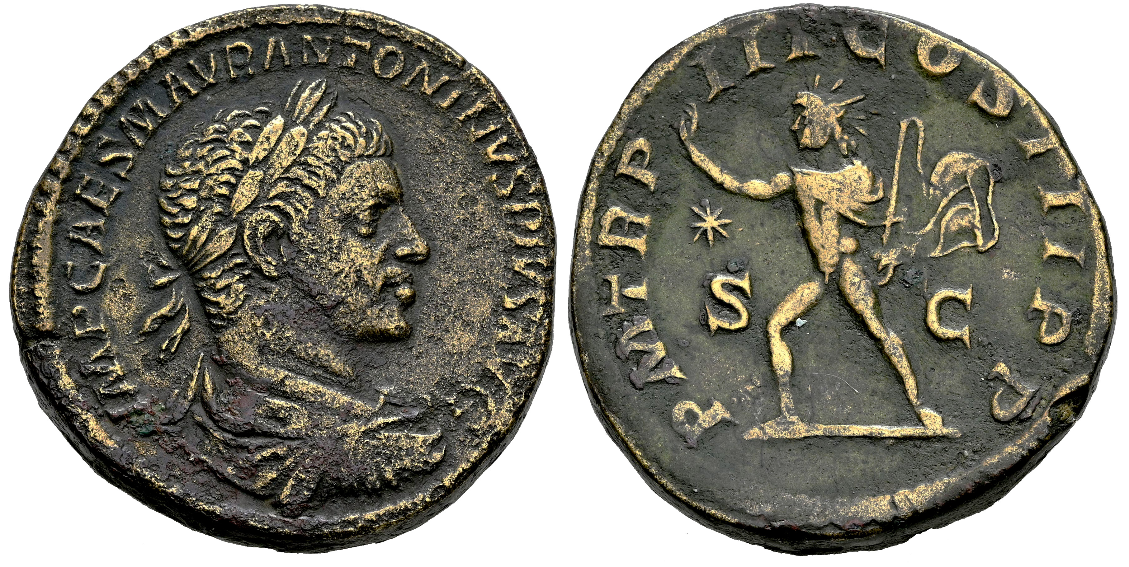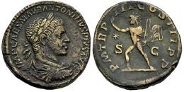 Elagabalus. Sestertius. 220 AD. Rome. (Ric-IV 300). (Bmcre-424). (C-156). Anv.: IMP CAES M AVR ANTONINVS PIVS AVG, laureate, draped and cuirassed bust to right. Rev.: P M TR P III COS III P P, Sol walking to left, raising right hand and holding whip with left; star in left field, S-C across fields. Ae. 22,04 g. Scarce. VF. Est...200,00.