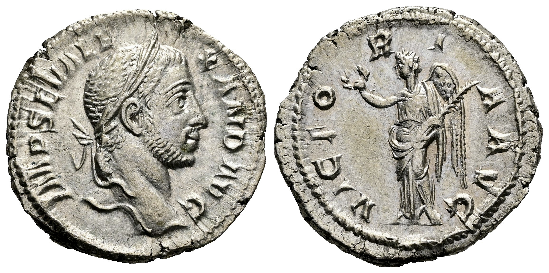 Severus Alexander. Denarius. 228-231 AD. Rome. (Ric-IV 212). (Bmcre-700). (Rsc-556). Anv.: IMP SEV ALEXAND AVG, laureate head to right. Rev.: VICTORIA AVG, Victory standing to left, holding wreath and palm. Ag. 3,22 g. Ex Soler & Llach (14/07/2009), lot 2363. Almost XF. Est...100,00.