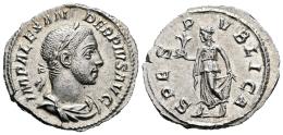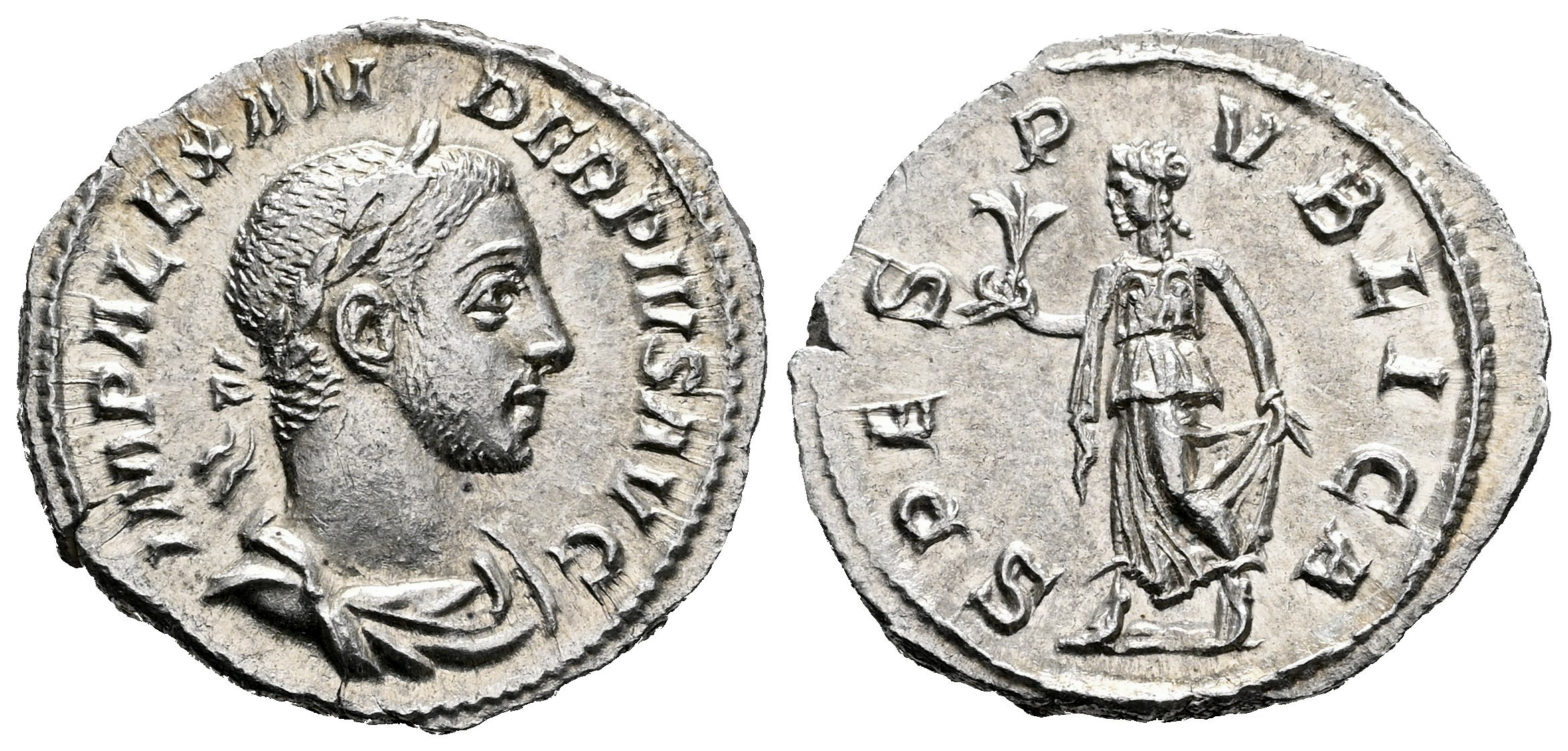 Severus Alexander. Denarius. 231-235 AD. Rome. (Ric-IV 254). (Bmcre-900). (Rsc-546). Anv.: IMP ALEXANDER PIVS AVG, laureate, draped and cuirassed bust to right. Rev.: SPES PVBLICA, Spes walking to left, holding flower and raising skirt. Ag. 2,84 g. Sharp, well-centered and luster. Ex Áureo&Calicó 217/3 (12/03/2009), lot 2002. AU. Est...180,00.