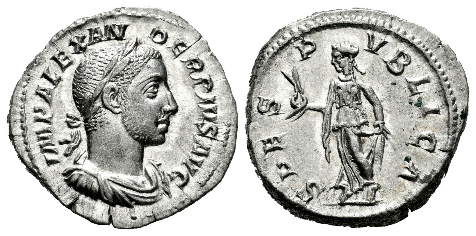 Severus Alexander. Denarius. 231-235 AD. Rome. (Ric-IV 254). (Bmcre-900). (Rsc-546). Anv.: IMP ALEXANDER PIVS AVG, laureate, draped and cuirassed bust to right. Rev.: SPES PVBLICA, Spes walking to left, holding flower and raising skirt. Ag. 4,19 g. A good sample. Traces of luster. XF. Est...150,00.
