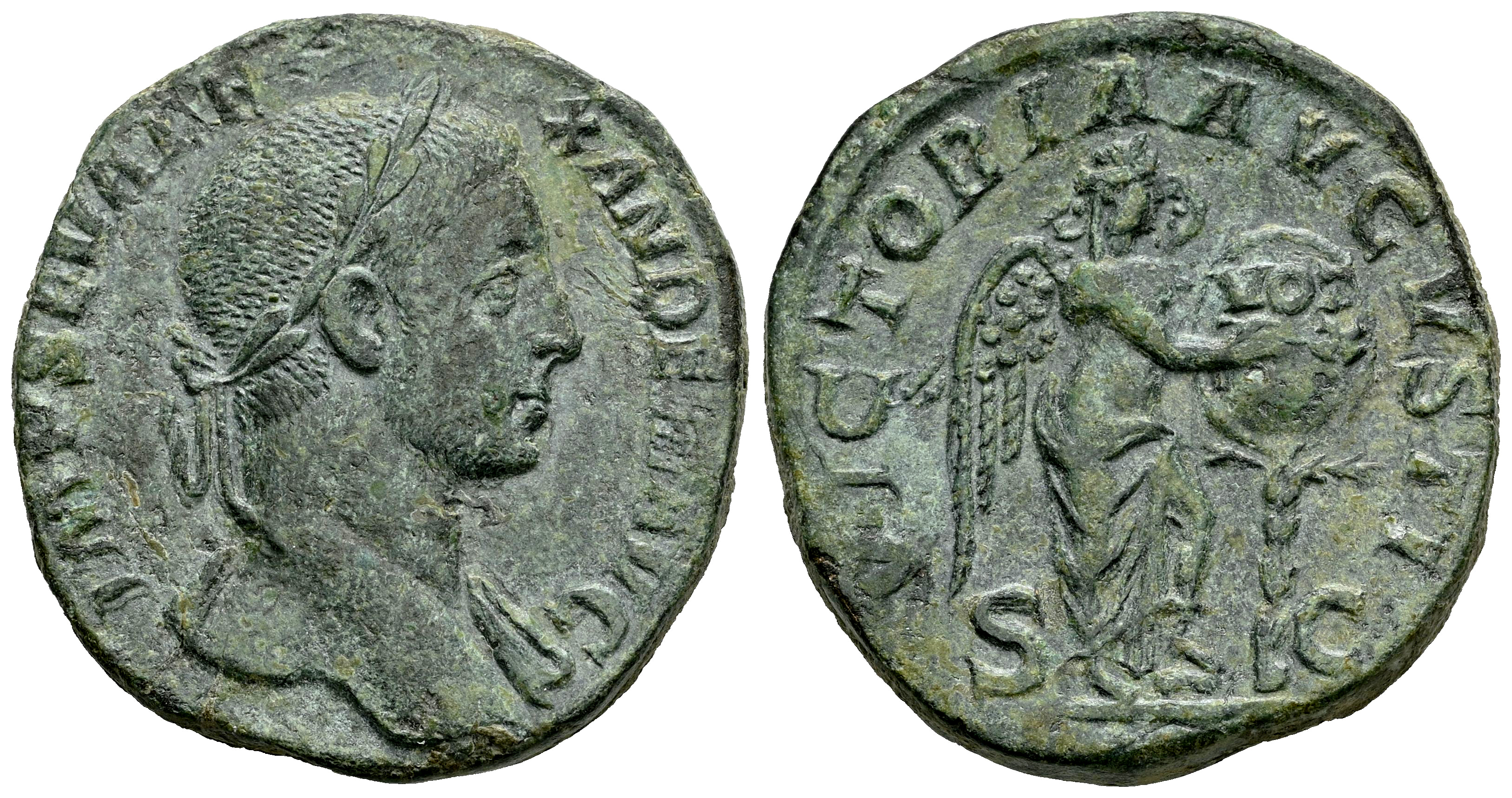 Severus Alexander. Sestertius. 230 AD. Rome. (Ric-IV 616). (Bmcre-643). (C-567). Anv.: IMP SEV ALEXANDER AVG, laureate bust to right, slight drapery on far shoulder. Rev.: VICTORIA AVGVSTI, Victory standing facing, head to right, with foot on helmet, inscribing VOT X on shield set on trunk of palm tree; S-C across fields. Ae. 16,94 g. Beautiful green patina. Choice VF/Almost XF. Est...150,00.
