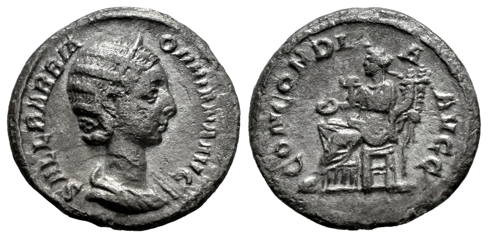 Orbiana. Denarius. 225-227 AD. Antioch. (Ric-IV 319). (Bmcre-287). (Rsc-1). Anv.: SALL BARBIA ORIBANA AVG, draped bust to right, wearing stephane. Rev.: CONCORDIA AVGG, Concordia seated to left, holding patera and double cornucopiae. Ag. 1,88 g. Scarce. Almost VF. Est...220,00.