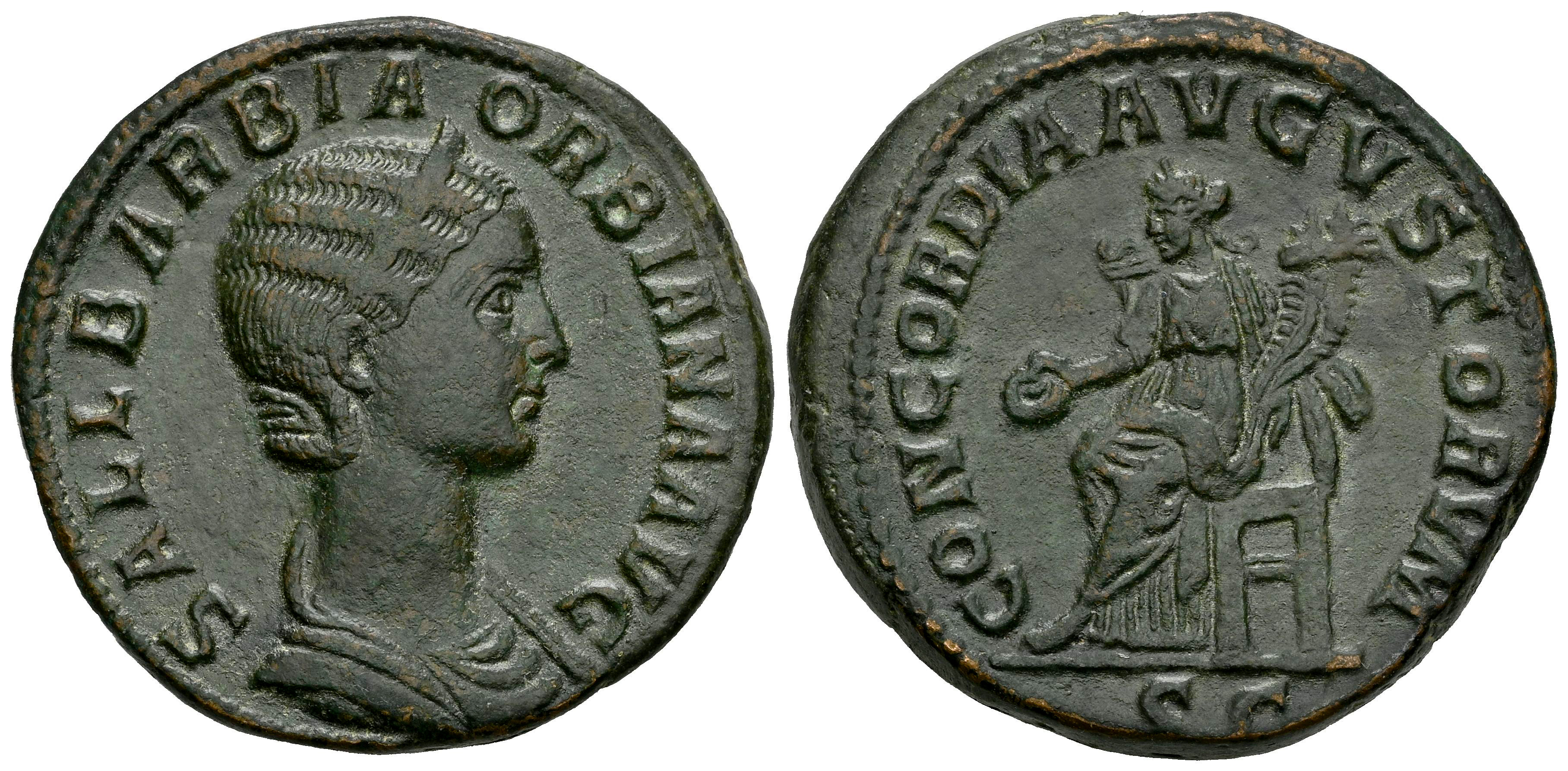 Orbiana. Sestertius. 225 AD. Rome. (Ric-IV 655 (Alexander)). (Bmcre-296 (Alexander)). (Ch-4). Anv.: SALL BARBIA ORBIANA AVG, diademed and draped bust to right. Rev.: CONCORDIA AVGVSTORVM, Concordia seated to left, holding patera and double cornucopiae; SC in exergue. Ae. 18,93 g. Very scarce. Almost XF. Est...1500,00.