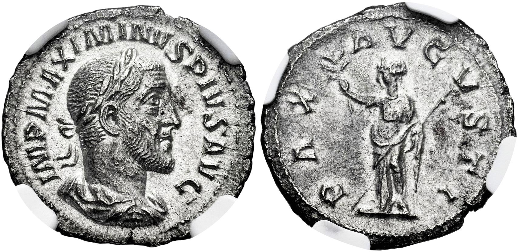 Maximinus I. Denarius. 235-236 AD. Rome. (Ric-IV 12). (Bmcre-68/71). (Rsc-31a). Anv.: IMP MAXIMINVS PIVS AVG, laureate, draped and cuirassed bust to right. Rev.: PAX AVGVSTI, Pax standing facing, head to left, holding branch in raised hand and transverse sceptre. Ag. Slabbed by NGC as XF. Est...200,00.