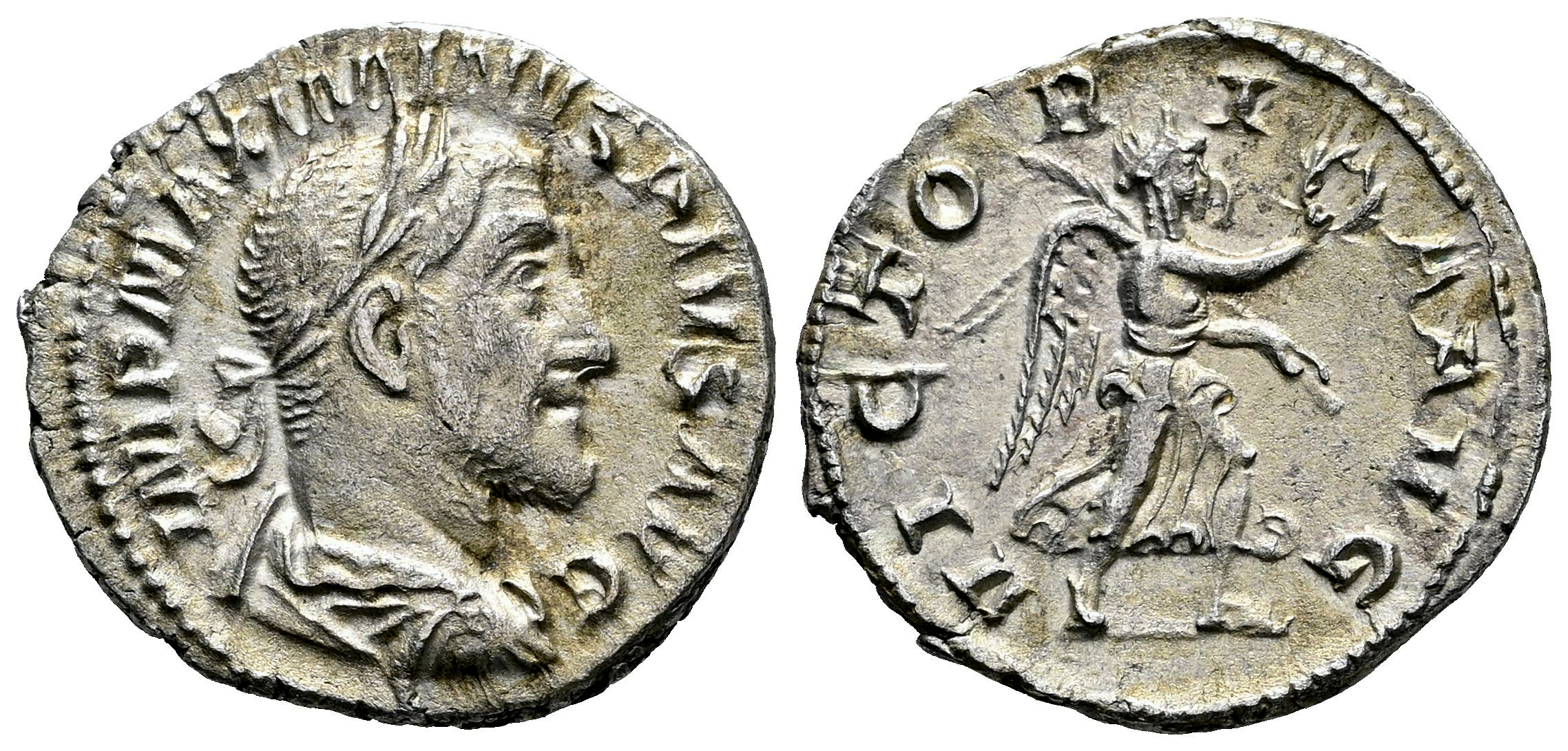 Maximinus I. Denarius. 236 d.C. Rome. (Ric-IV 16). (Bmcre-105). (Rsc-99a). Anv.: IMP MAXIMINVS PIVS AVG, laureate, draped and cuirassed bust to right. Rev.: VICTORIA AVG, Victory advancing to right, holding wreath and palm. Ag. 2,64 g. Choice VF/Almost XF. Est...90,00.