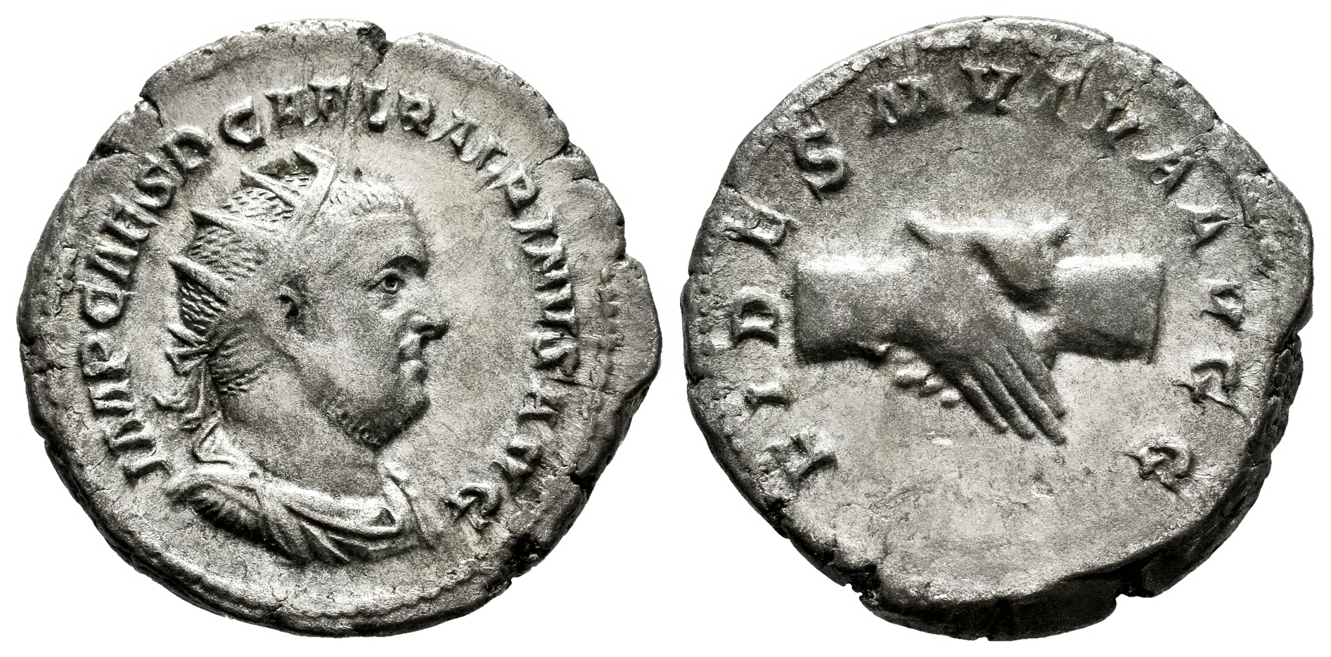 Balbinus. Antoninianus. 238 AD. Rome. (Ric-IV 12). (Bmcre-76). (Rsc-17). Anv.: IMP CAES D CAEL BALBINVS AVG, radiate, draped and cuirassed bust to right. Rev.: PIETAS MVTVA AVGG, clasped hands. Ag. 5,51 g. Thick planchet. High weight. Scarce. Almost VF/VF. Est...200,00.