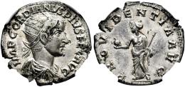 Gordian III. Antoninianus. 238-244 AD. Antioch. (Ric-172). (Bland-44). Anv.: IMP CAES M ANT GORDIANVS AVG. Radiate, draped and cuirassed bust right. Rev.: P M TR P II COS P P. Providentia standing left, holding sceptre and globe. Ag. Slabbed by NGC as AU. Est...100,00.