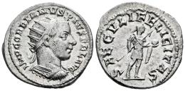 Gordian III. Antoninianus. 242-244 AD. Antioch. (Ric-IV 216). (Rsc-319a). Anv.: IMP GORDIANVS PIVS FEL AVG, radiate and cuirassed bust to right. Rev.: SAECVLI FELICITAS, emperor standing to right, holding transverse spear and globe. Ag. 4,42 g. Ex VAuctions 233 (03/09/2009), lot 88. Almost XF/XF. Est...70,00.