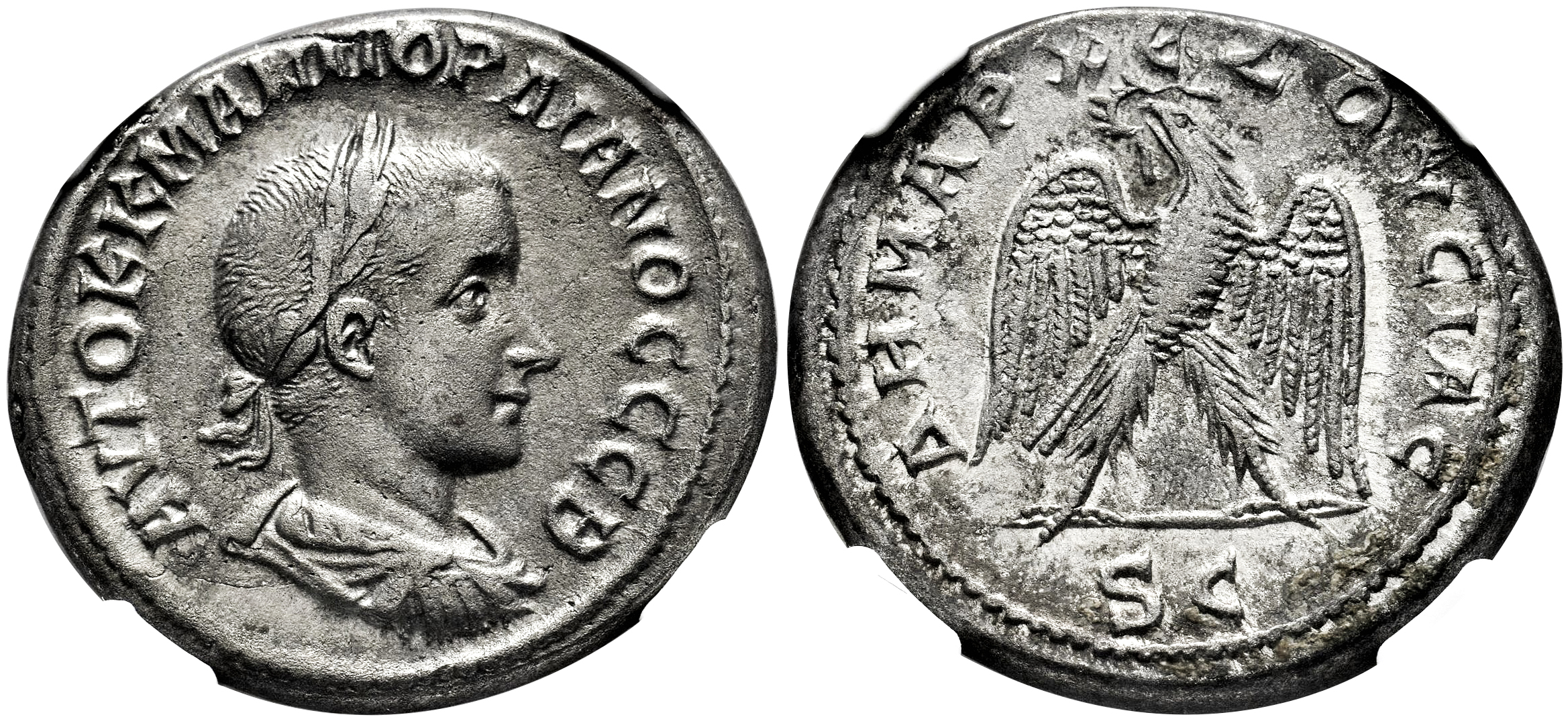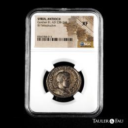 Gordian III. Seleucis and Pieria. Tetradrachm. 240 AD. Antioch. (RPC-VII 2 3488). (Prieur-282). (McAlee-860). Anv.: AYTOK K M ANT ΓOΡΔΙΑΝΟC CЄB, laureate, draped and cuirassed bust to right. Rev.: ΔΗMAΡX ЄΞΟΥϹΙΑϹ, eagle standing facing, head and tail to left, holding wreath in beak; SC in exergue. Bi. Slabbed by NGC as XF. Est...150,00.