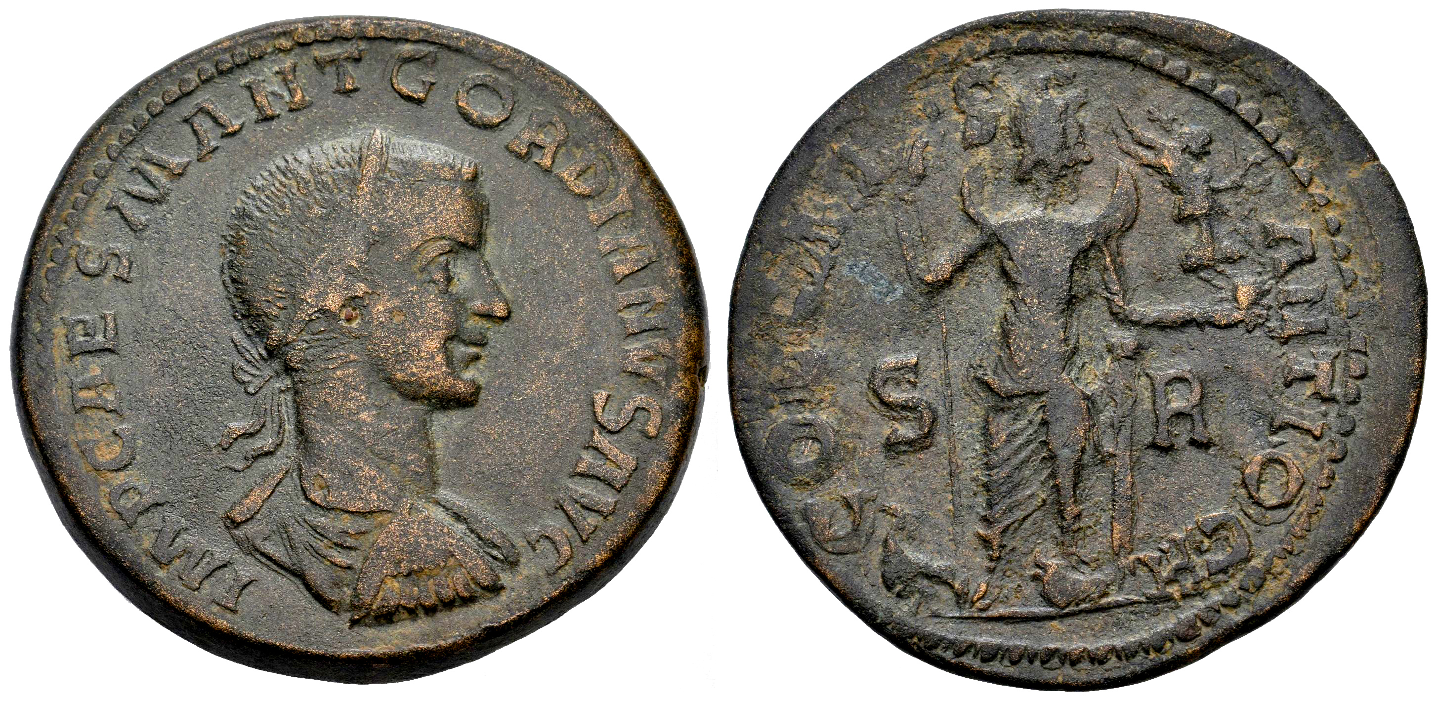 Gordian III. AE 35. 238-244 AD. Antioch. Pisidia. (RPC-VII 2 online ID 3431). (Sng France-1207). Anv.: IMP CAES M ANT GORDIANVS AVG, laureate, draped and cuirassed bust to right. Rev.: COL CAES ANTIOCH, Mên standing facing, head to right, with foot on bucranium, holding sceptre and Nike on globe; to left, cock standing left; column to right; S-R across fields. Ae. 27,96 g. Choice VF/VF. Est...140,00.