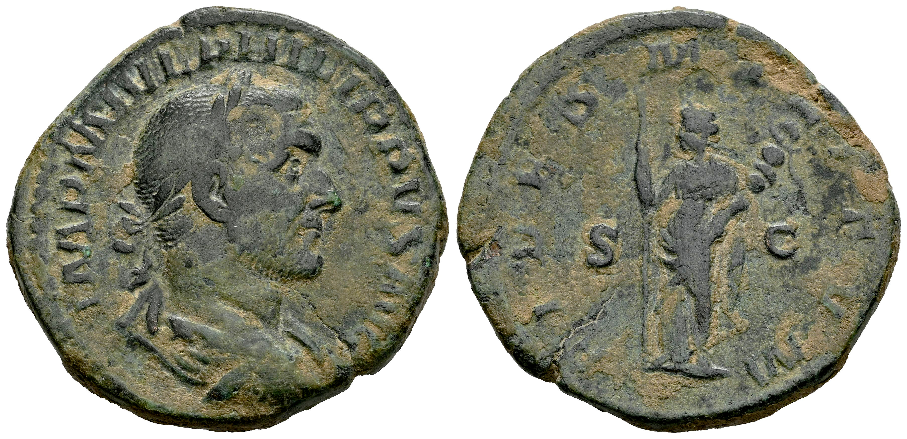 Philip I. Sestertius. 244-245 AD. Rome. (Ric-172a). Anv.: IMP M IVL PHILIPPVS AVG. Laureate, draped and cuirassed bust of Philip I to right. Rev.: FIDES MILITVM / S - C. Fides standing front, head to left, holding two signa. Ae. 17,33 g. Almost VF. Est...70,00.