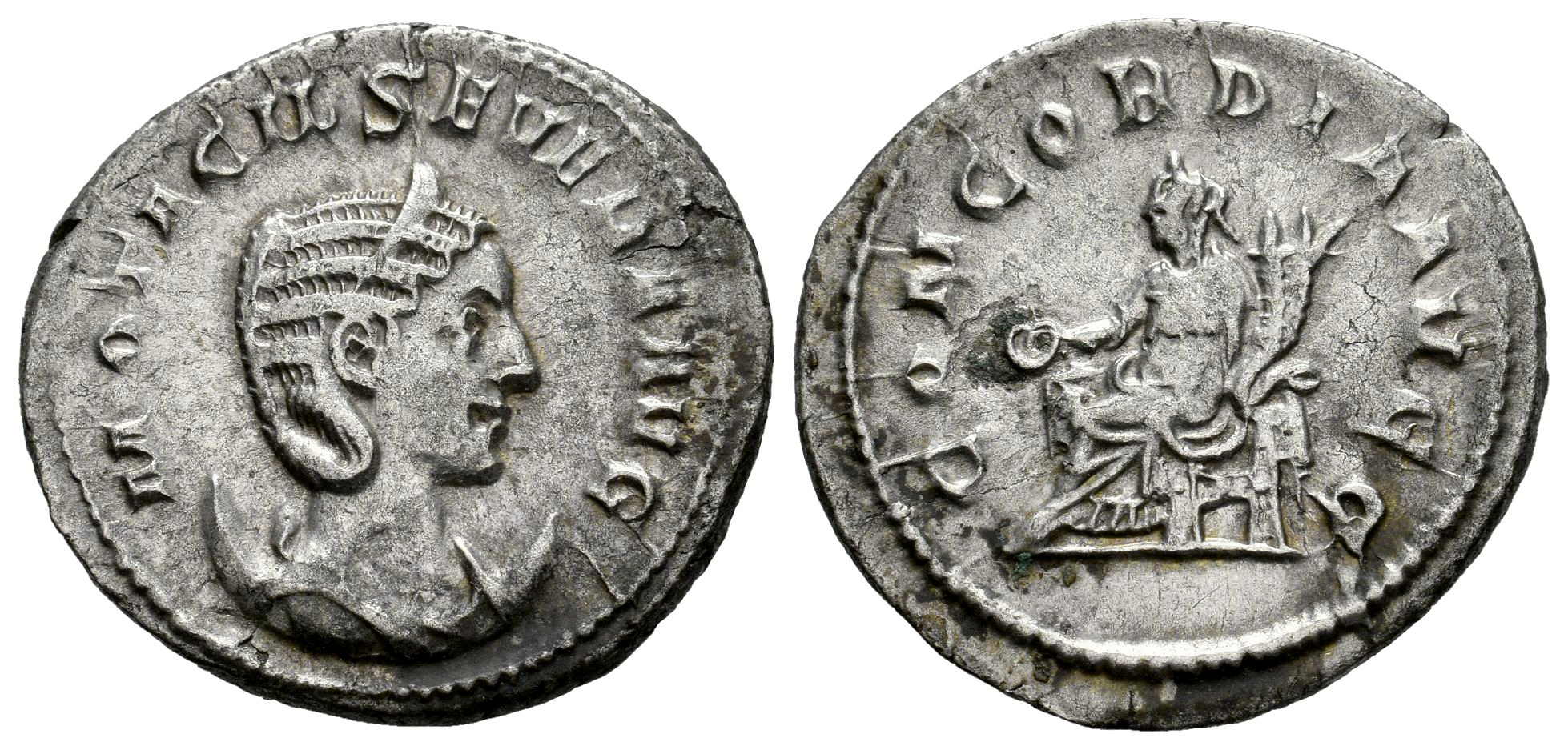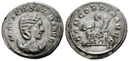 Otacilia Severa. Antoninianus. 246-248 AD. Rome. (Ric-IV 125c). (Rsc-4). Anv.: M OTACIL SEVERA AVG, diademed and draped bust to right, set on crescent. Rev.: CONCORDIA AVGG, Concordia seated to left, holding patera and cornucopiae. Ag. 4,14 g. Choice VF. Est...60,00.