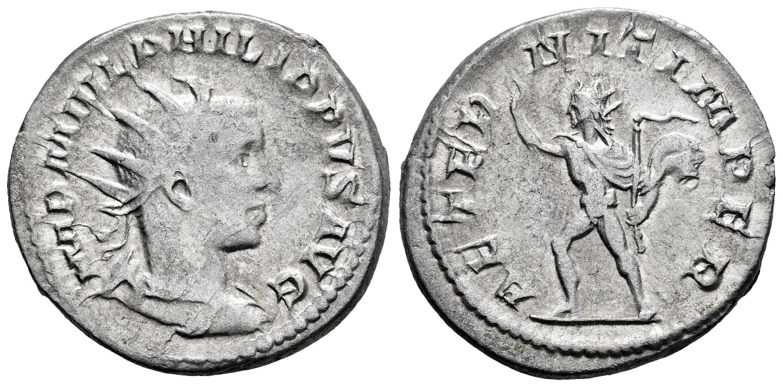 Philip II. Antoninianus. 246-247 AD. Rome. (Ric-IV 226 corr.). (Rsc-6). Anv.: IMP M IVL PHILIPPVS AVG, radiate, draped and cuirassed bust to right. Rev.: AETERNIT IMPER, Sol advancing left with whip . Ag. 5,26 g. Almost VF/VF. Est...45,00.