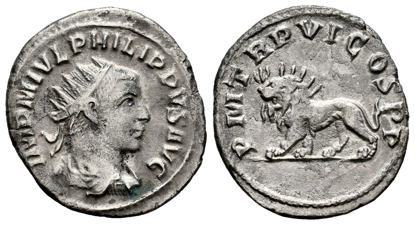 Philip II. Antoninianus. 249 AD. Antioch. (Ric-239). (Cohen-43). Anv.: IMP M IVL PHILIPPVS AVG Radiate, draped and cuirassed bust to right. Rev.: P M TR P VI COS P P Lion, radiate, advancing left with thunderbolt in his mouth. Ag. 3,01 g. Very rare. VF. Est...200,00.