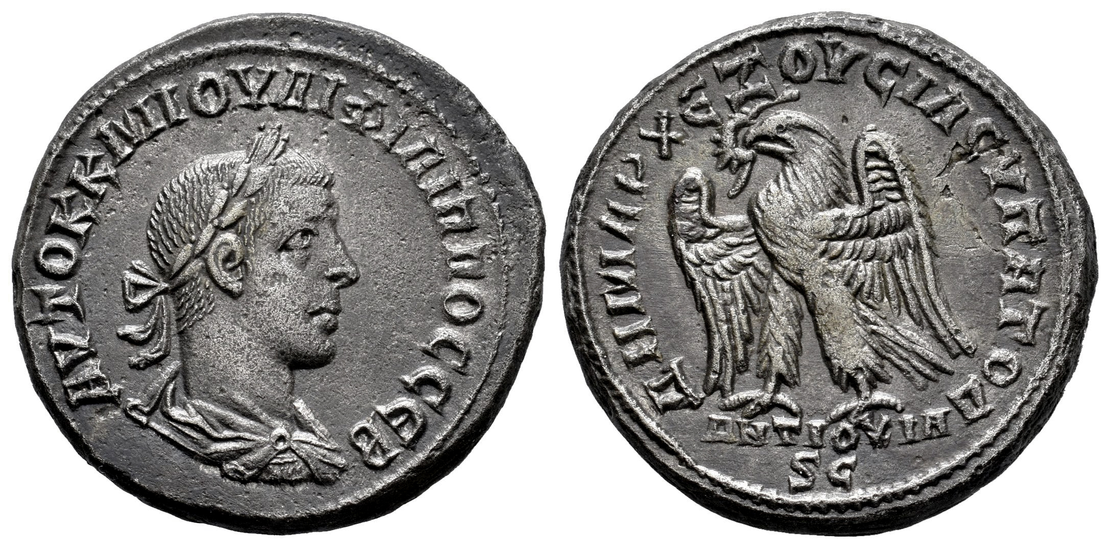 Philip II. Seleucis and Pieria. Tetradrachm. 248-249 AD. Antioch. (Prieur-473). (McAlee-1043). (RPC-VIII / ID 28990). Anv.: ΑΥΤΟΚ Κ Μ ΙΟΥΛΙ ΦΙΛΙΠΠΟC CЄΒ, laureate, draped and cuirassed bust to right. Rev.: ΔΗΜΑΡΧ ЄΞΟYCΙΑC YΠΑ ΤΟ Δ, eagle standing to left, with wings spread, holding wreath in beak; ANTIOXIA SC in two lines below. Bi. 11,26 g. Almost XF. Est...140,00.
