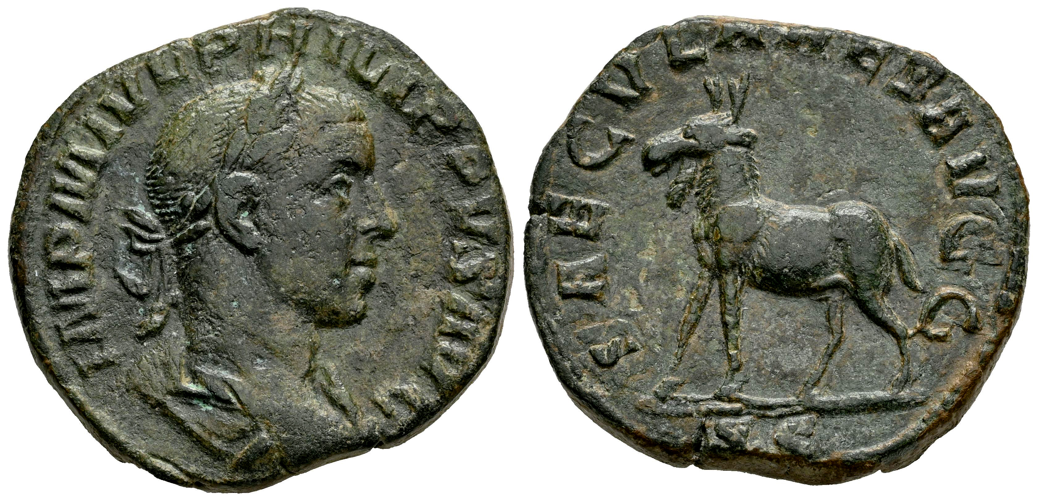 Philip II. Sestertius. 248 AD. Rome. (Ric-IV 264a). (C-73). Anv.: IMP M IVL PHILIPPVS AVG, laureate, draped and cuirassed bust to right. Rev.: SAECVLARES AVGG, goat standing to left; SC in exergue. Ae. 17,15 g. VF/Choice VF. Est...150,00.