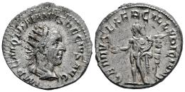 Trajan Decius. Antoninianus. 249-251 AD. Rome. (Ric-IV 16c). (Rsc-49). Anv.: IMP C M Q TRAIANVS DECIVS AVG, radiate, draped and cuirassed bust to right. Rev.: GENIVS EXERC ILLVRICIANI, Genius, wearing polos on head, standing facing, head to left, holding patera and cornucopiae; to right, standard. Ag. 4,29 g. Slight traces of original luster. Almost XF/XF. Est...65,00.