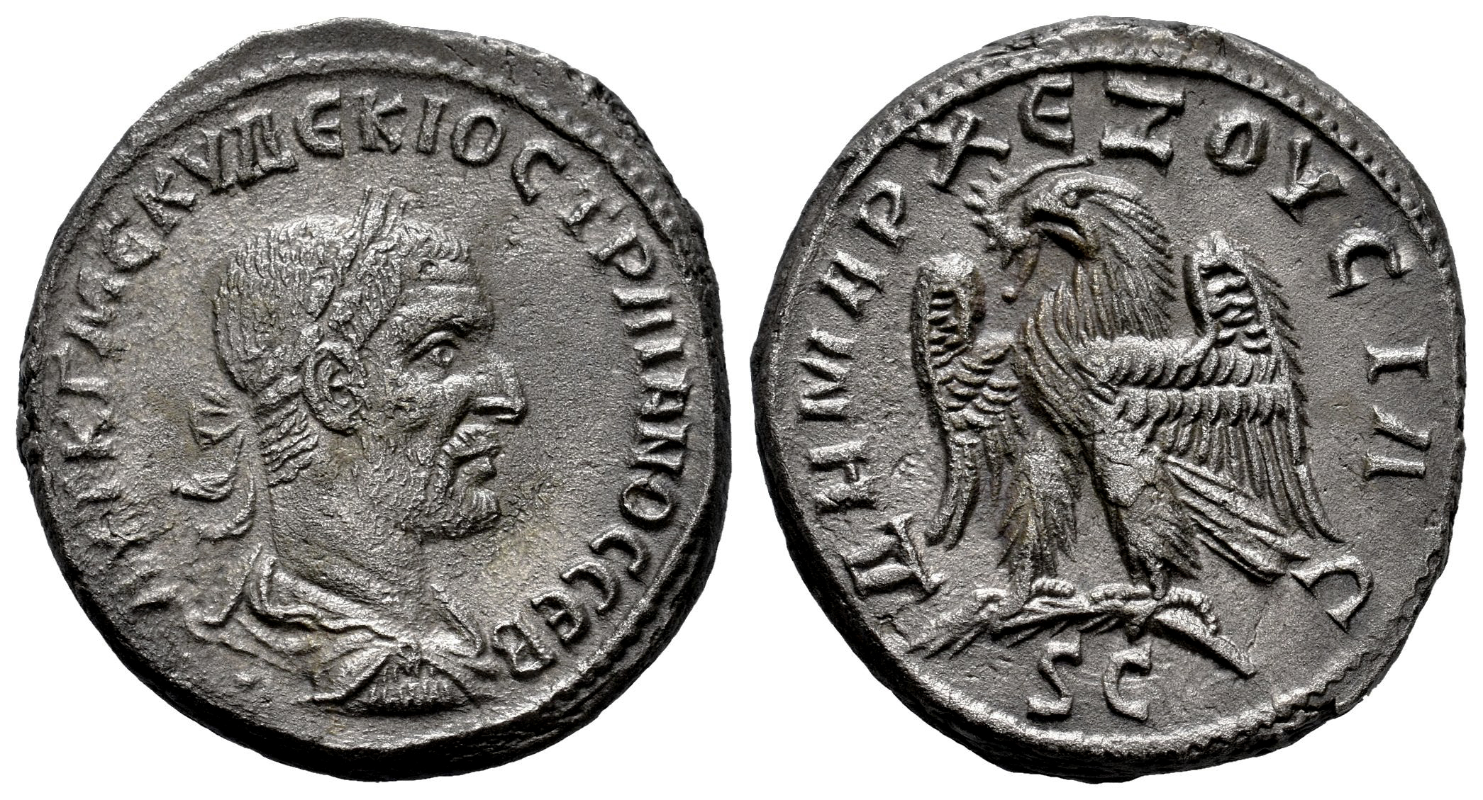 Trajan Decius. Seleucis and Pieria. Tetradrachm. 249-251 AD. Antioch. (Prieur-522). (McAlee-1116a). (RPC-IX 1621). Anv.: AVT K Γ MЄ KY ΔЄKIOC TPAIANOC CЄB, laureate, draped and cuirassed bust to right; • below bust. Rev.: ΔHMAPX ЄΞOYCIAC, eagle standing to left on palm, with wings spread, holding wreath in beak; SC in exergue. Bi. 12,10 g. Choice VF/XF. Est...140,00.