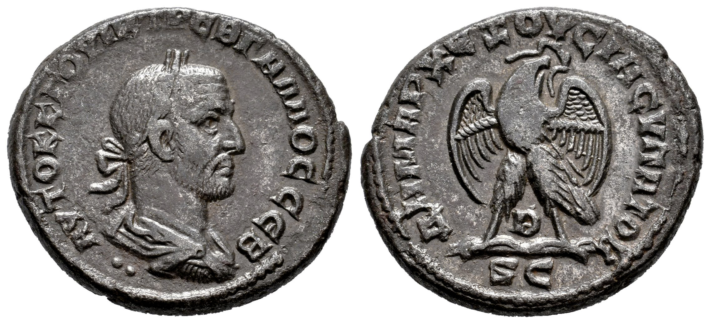 Trebonianus Gallus. Seleucis and Pieria. Tetradrachm. 251 AD. Antioch. (Prieur-659). (McAlee-1173b). (RPC-IX 1794). Anv.: AVTOK K Γ OYIB TPЄB ΓAΛΛOC CЄB, laureate, draped and cuirassed bust to right; •• below bust. Rev.: ΔHMAPX ЄΞOYCIAC, eagle standing to left on palm, head and tail to right, with wings spread, holding wreath in beak; B below, SC in exergue. Bi. 11,94 g. Ex. Prof. Dr. Peter Robert Franke Collection. Choice VF. Est...120,00.