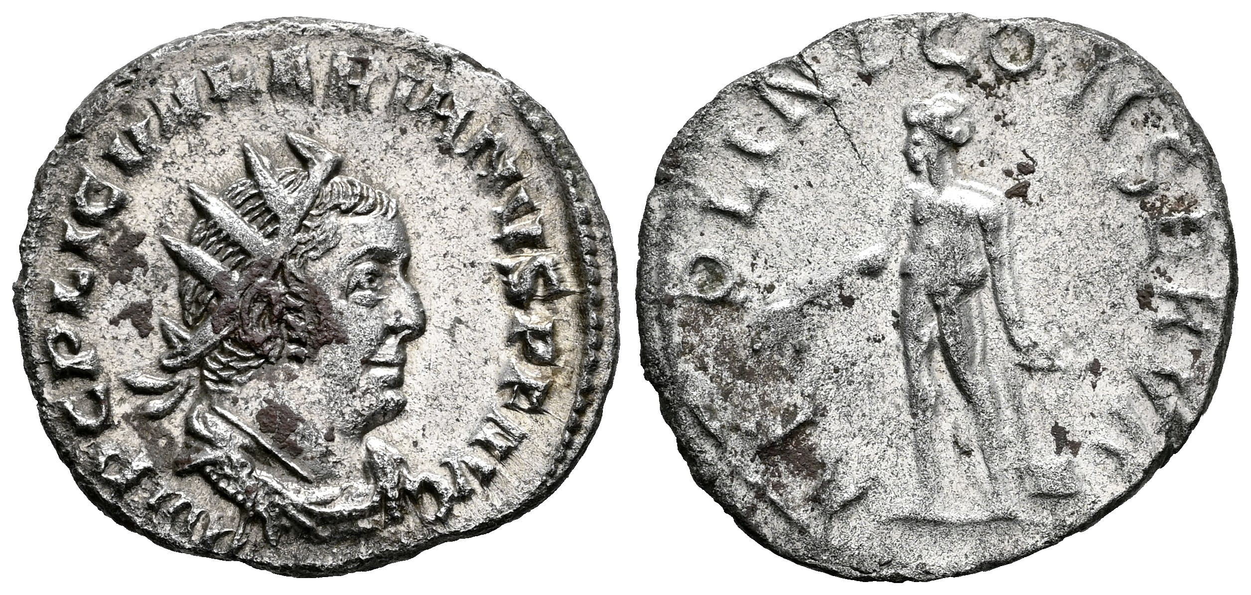 Valerian I. Antoninianus. 254-256 AD. Rome. (Ric-V 1 72). (MIR-72c). (Rsc-17). Anv.: IMP C P LIC VALERIANVS P F AVG, radiate, draped and cuirassed bust to right. Rev.: APOLINI CONSREVA, Apollo standing facing, head to left, holding laurel branch and resting lyre on rock. Bi. 3,08 g. Rust on obverse. Almost XF/VF. Est...50,00.