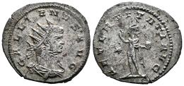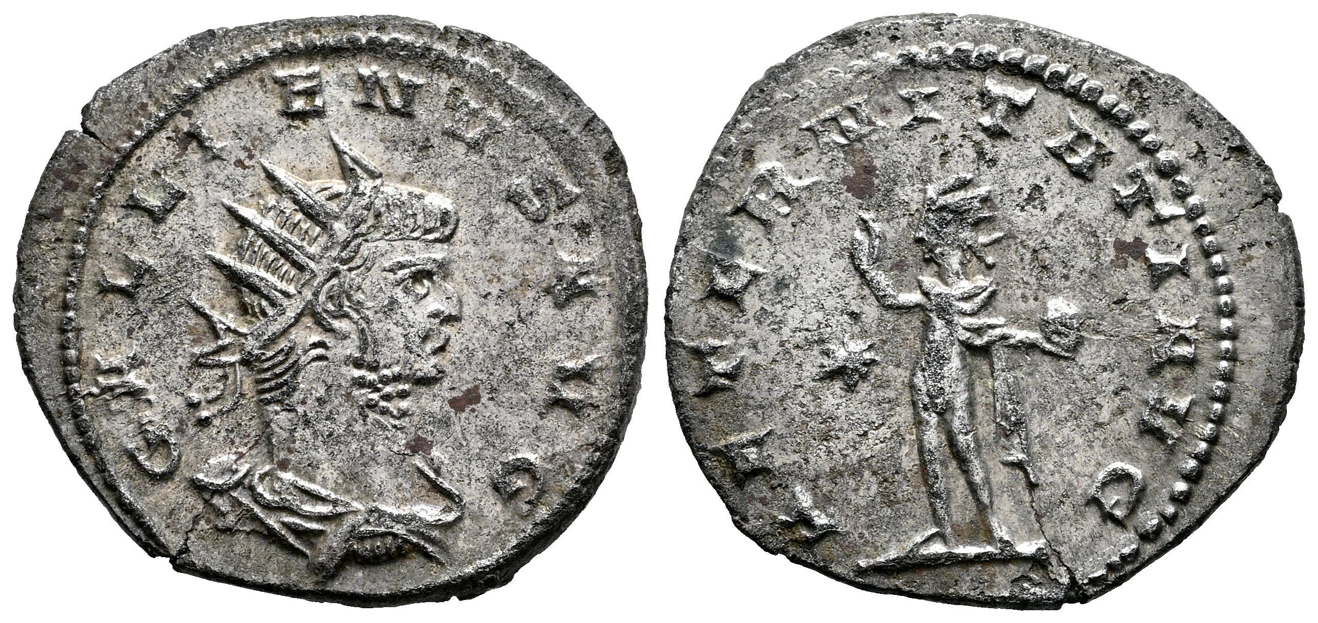Gallienus. Antoninianus. 253-268 AD. Antioch. (Ric-1611g). (MIR-1611g). Anv.: GALLIENVS AVG. Radiate and cuirassed bust to right. Rev.: AETERNITATI AVG. Sol standing left, holding globe and raising right hand, star in left field. Bi. 3,44 g. Original silvering. Almost XF. Est...45,00.