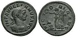 Aurelian. Denarius. 270-275 AD. Rome. (Ric-1853). Anv.: IMP AVRELIANVS AVG. Laureate and cuirassed bust right. Rev.: VICTORIA AVG. Victory advancing left, holding wreath and palm frond bound captive seated left, head right; B in exergue. Ae. 2,21 g. Choice VF. Est...75,00.