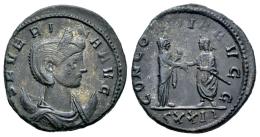 Severina. Antoninianus. 274 AD. Rome. (Ric-V 1 3). (MER/RIC-1792). Anv.: SEVERINA AVG, diademed and draped bust to right, set on crescent. Rev.: CONCORDIA AVGG, Emperor standing to right, clasping hand of Empress standing to left; ςXXIR in exergue. Bi. 3,96 g. Choice VF. Est...60,00.