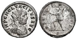 Tacitus. Antoninianus. 275-276 AD. Ticinum. (Ric-145). (Ric-Online V 3408). (CBN-1681/3). Anv.: IMP C M CL TACITVS AVG. Radiate, draped and cuirassed bust to right. Rev.: MARTI PACIF. Mars advancing left, holding olive branch in his right hand and spear and shield with his left; S in exergue. Bi. 3,70 g. A good sample. With plenty of original luster. Thin crack. Scarce in this grade. Almost MS. Est...120,00.
