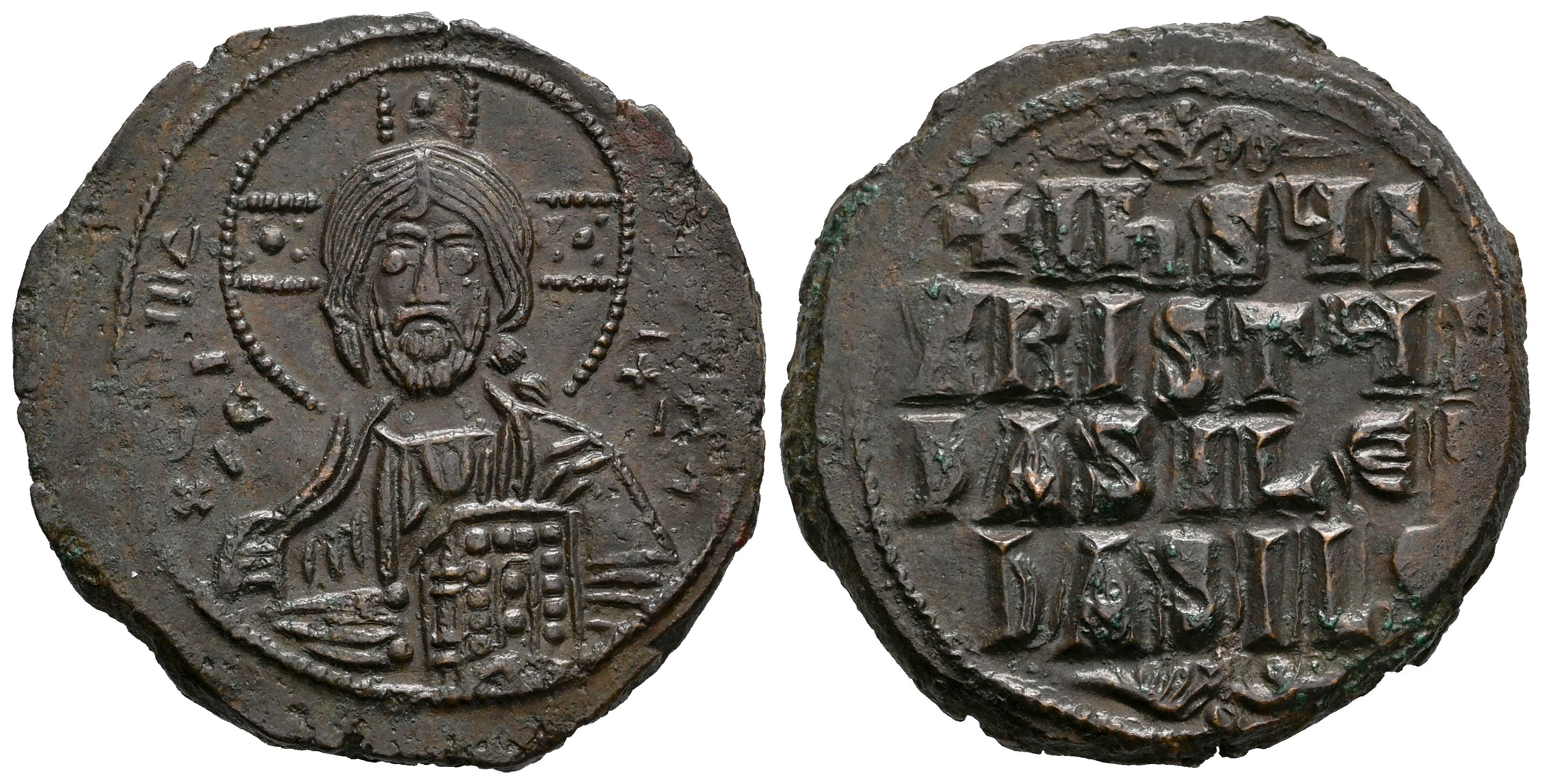 Anonymous. Time of Basil II and Constantine VIII. 40 Nummi. 976-1065 AD. Constantinople. (Doc-Class A2.24a). (Sear-1813/18). Anv.: + ЄMMA NOVHΛ, facing bust of Christ Pantokrator, holding book of Gospels; IC-XC across fields. Rev.: +IҺSЧS XRISTЧS ЬASILЄЧ ЬASILЄ in four lines, floral ornaments above and below; all within dotted circular border.. Ae. 11,45 g. A good sample for this type. Rare in this condition. XF/Almost XF. Est...80,00.