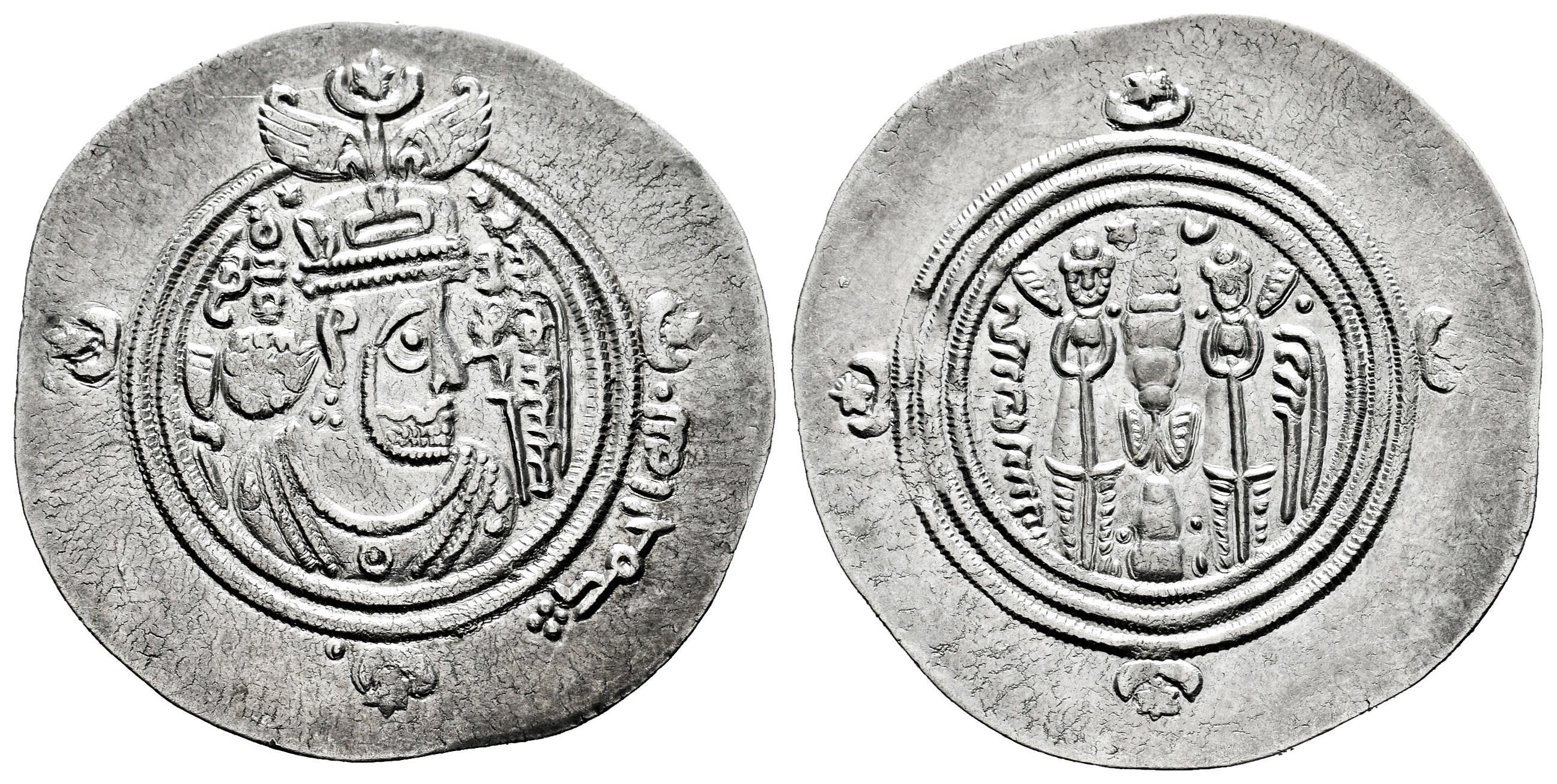 Umayyad Caliphate. 'Abd al-Malik ibn Marwan. Drachm. 68 AH = 687/8 AD. BYS (Bishapur). (Album-21). (Walker-Arab-Sasanian 193). (SICA-I 163). Anv.: Draped bust resembling Khosrau II to right, wearing an elaborate mural crown; behind head, ‘GDE / ʾp̄zwt'’ (‘[may his] glory increase’ in Pahlavi); before head, ‘ʾwml Y / ʾwbytʾlʾʾn’ (‘ʿUmar ibn ʿUbayd Allah’ in Pahlavi); in the outer margin, ‘li-llāh al-ḥamd’ (‘Praise to Allah’ in Arabic). Rev.: Fire altar with ribbons, flanked by two attendants; above altar, star and crescent; to left, date in Pahlavi; to right, BYŠ (abbreviation for the name of the mint in Pahlavi). Ag. 4,00 g. Choice VF. Est...150,00.