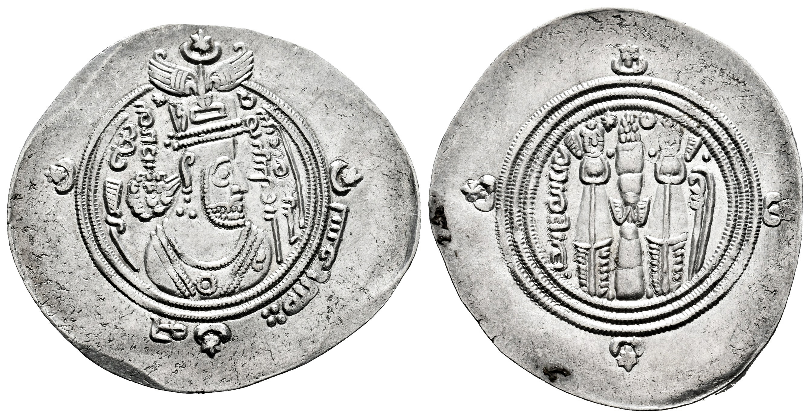 Umayyad Caliphate. 'Abd al-Malik ibn Marwan. Drachm. 75 AH = 694/5 AD. BYS (Bishapur). (Album-31). Anv.: Draped bust resembling Khosrau II to right, wearing an elaborate mural crown; behind head, ‘GDE / ʾp̄zwt'’ (‘[may his] glory increase’ in Pahlavi); before head, ‘mwhʾlp' Y / ʾbwcwplʾʾn’ (‘al-Muhallab son of Abu Sufra’ in Pahlavi); in the outer margin, ‘bism Allāh’ (‘In the name of Allah’ in Arabic). Rev.: Fire altar with ribbons, flanked by two attendants; above altar, star and crescent; to left, date in Pahlavi; to right, BYŠ (abbreviation for the name of the mint in Pahlavi). Ag. 4,15 g. Almost XF. Est...150,00.