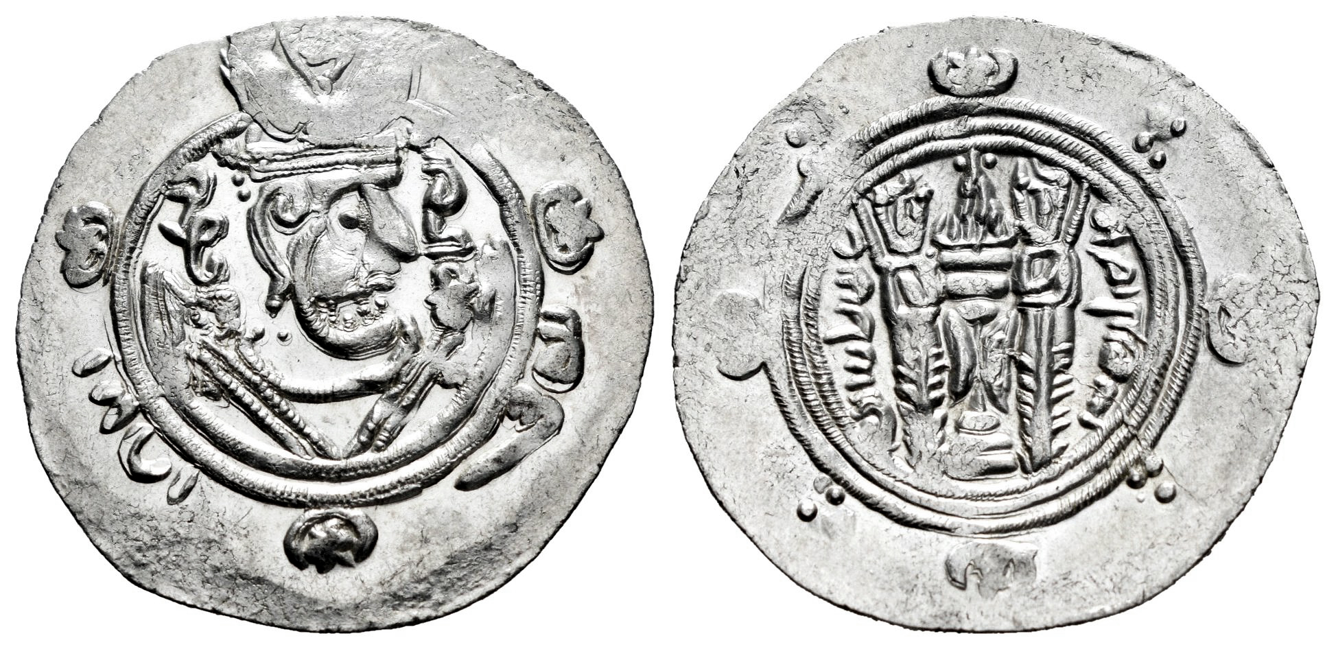 Abbasid Caliphate. AFZWT type, time of Al-Rashid. Hemidrachm. PYE 134 = 169 AH. Tabaristán. (Album-73). (Malek-159.1). Anv.: Crowned and draped bust to right; behind head, GDH ('kingship' in Pahlawi); before head, 'AFZUT' ('may increase' in Pahlawi); in outer margin, APD / NWKW ('excellent' and 'good' in Pahlawi). Rev.: Sasanian fire altar set on three steps, flanked by two attending priests (mabedh) standing facing; to left, date; to right, mint TPURSTAN ('Tabaristan' in Pahlawi). Ag. 1,99 g. Variant without any decoration on the chest. Traces of original luster. Choice VF/XF. Est...60,00.