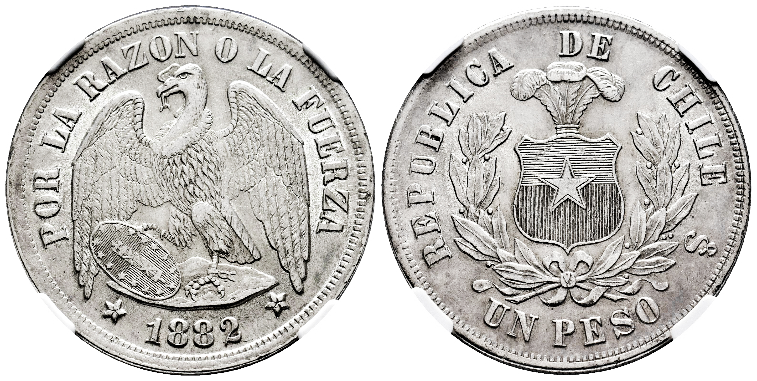 Chile. 1 peso. 1882. Santiago. (Km-142.1). Ag. Original luster. Slabbed by NGC as MS 62. Est...250,00.