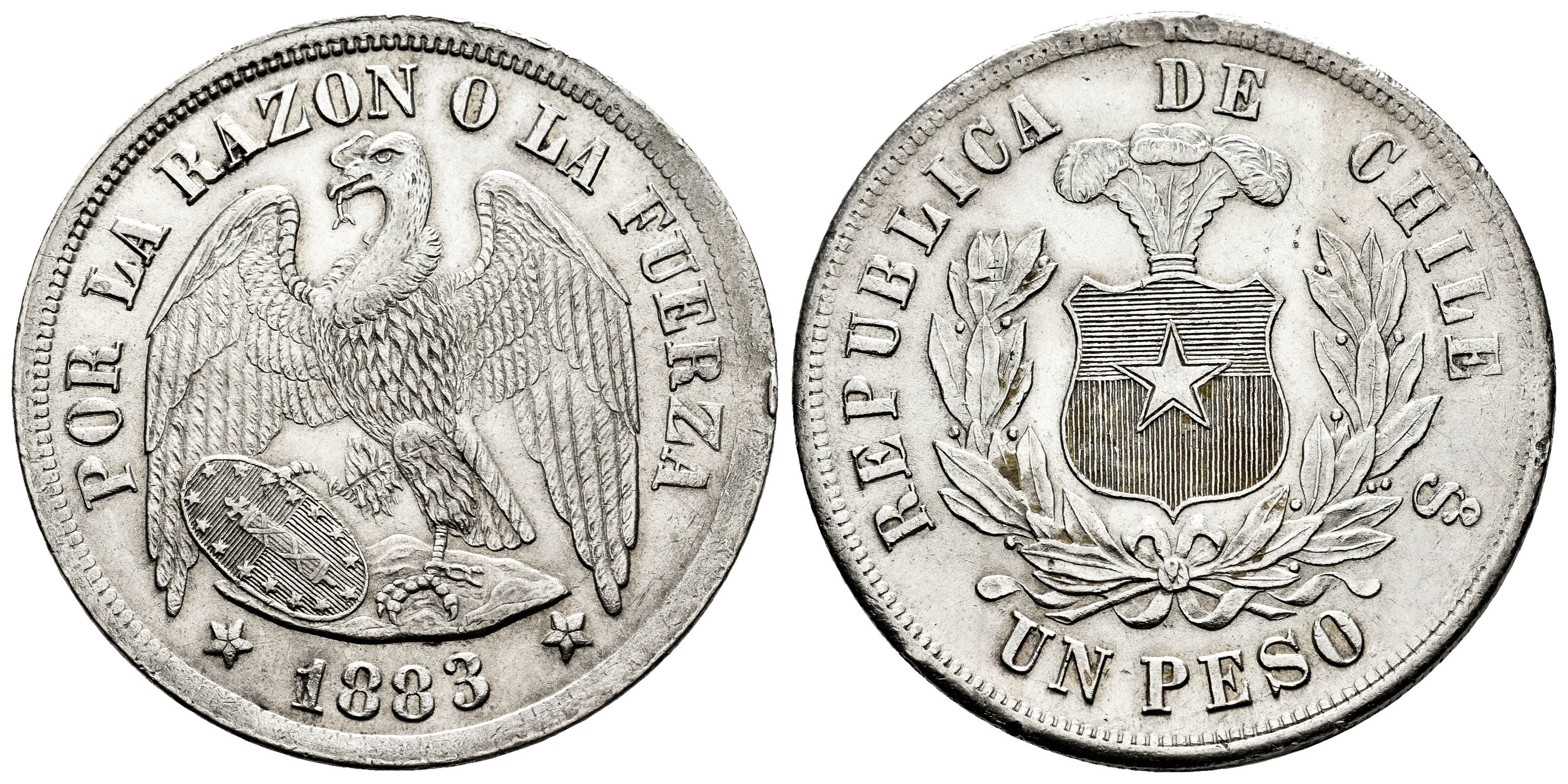 Chile. 1 peso. 1883. Santiago. (Km-142). Ag. 24,97 g. Minor nicks on edge. Original luster. XF. Est...90,00.