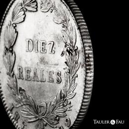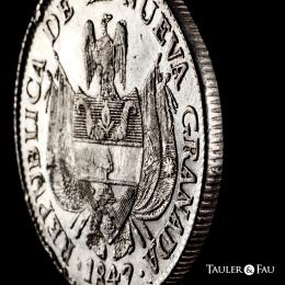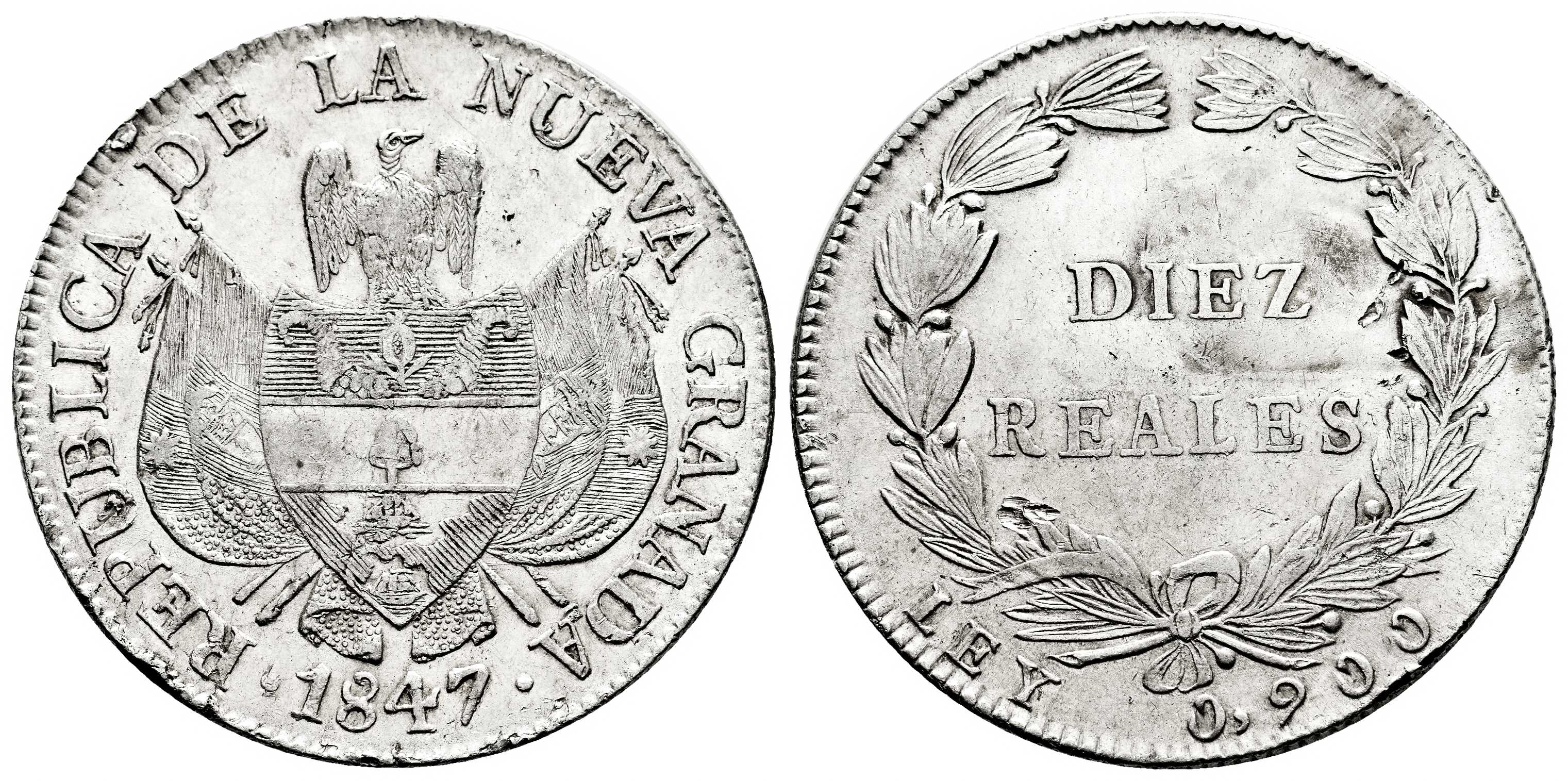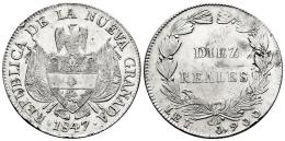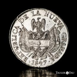 Colombia. 10 reales. 1847. Bogotá. (Km-107). Ag. 24,89 g. Traces of luster. Minor nicks on edge. Choice VF. Est...120,00.
