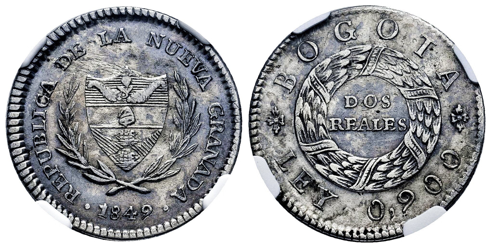 Colombia. 2 reales. 1849. Bogotá. (Km-105). (Restrepo-190.5). Ag. Soft tone. Slabbed by NGC as AU Details, Cleaned. Est...100,00.