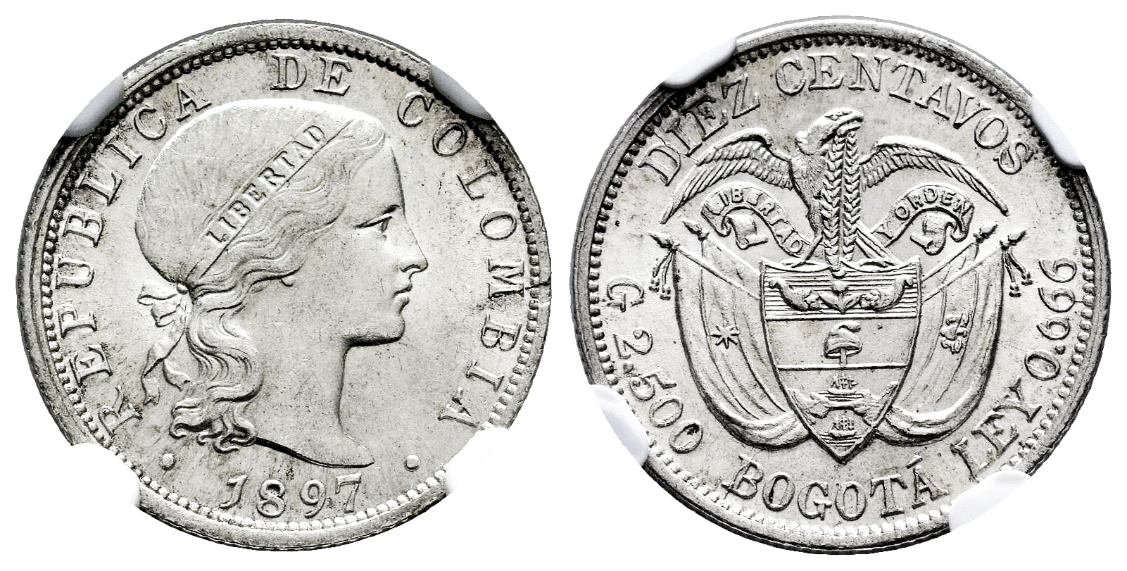 Colombia. 10 centavos. 1897. Bogotá. (Km-188). (Restrepo-373.1). Ag. Plenty of original luster. Slabbed by NGC as MS 64. Only 1 finer specimen in the NGC census. Est...150,00.