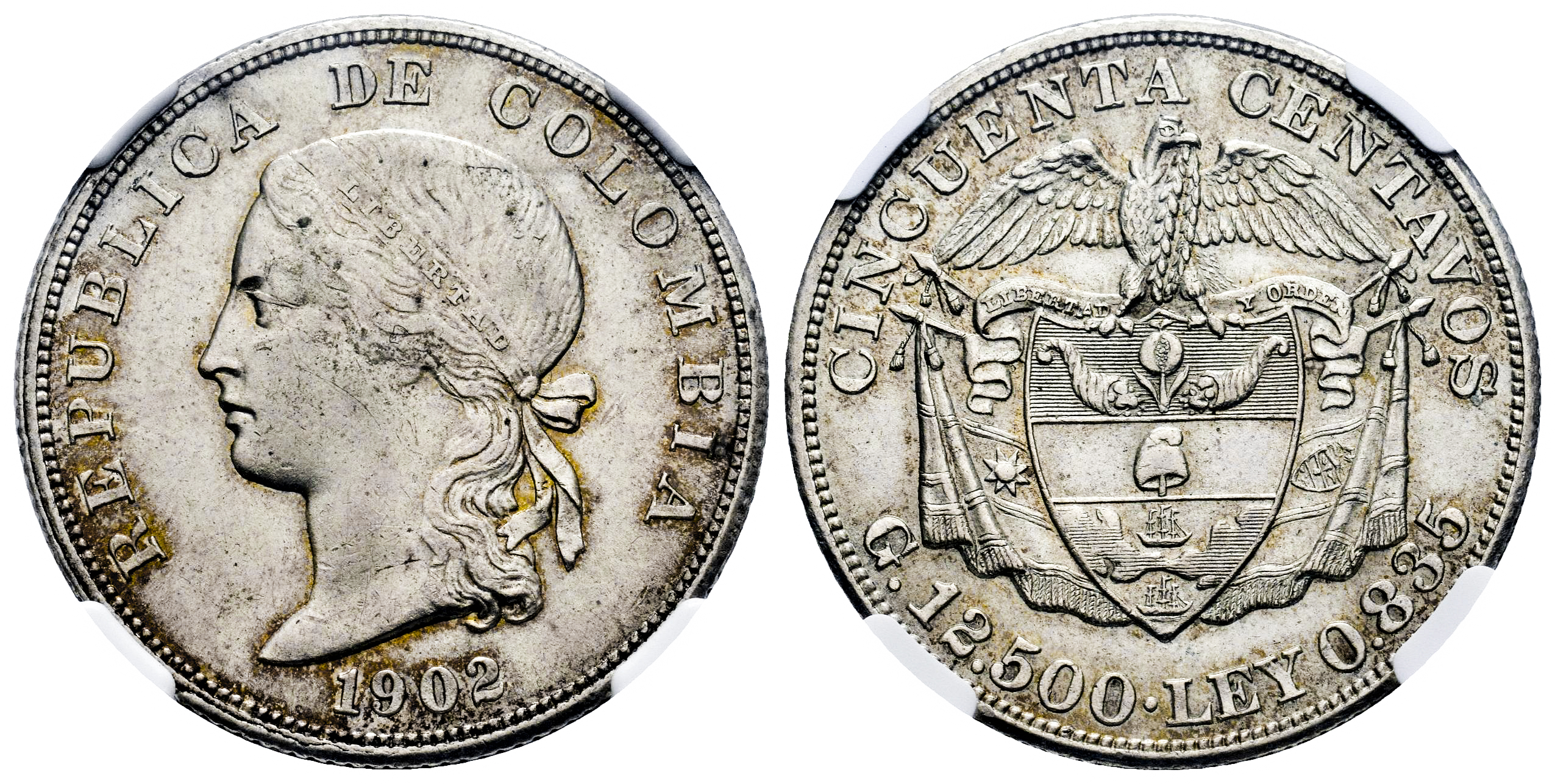 Colombia. 50 centavos. 1902. Philadelphia. (Km-192). (Schön-8). Ag. Soft tone. Slabbed by NGC as AU 58. Est...120,00.