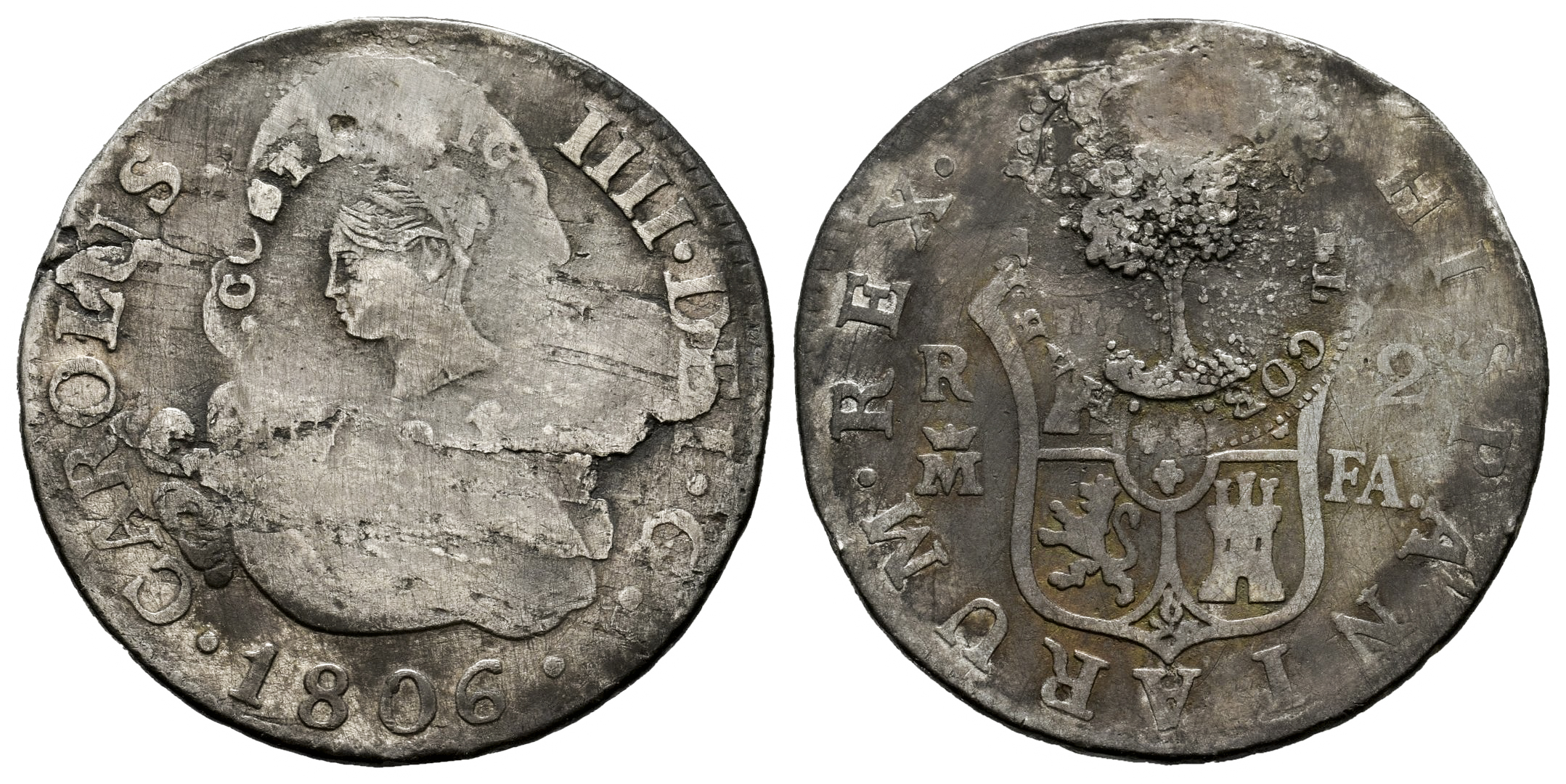 Costa Rica. Ag. 5,47 g. Double countermark from Costa Rica applied in 1845 for circulation as 2 reales, on a 2 reales coin dated 1806, minted in Madrid under Charles IV, with assayers FA. Rare. VF. Est...300,00.