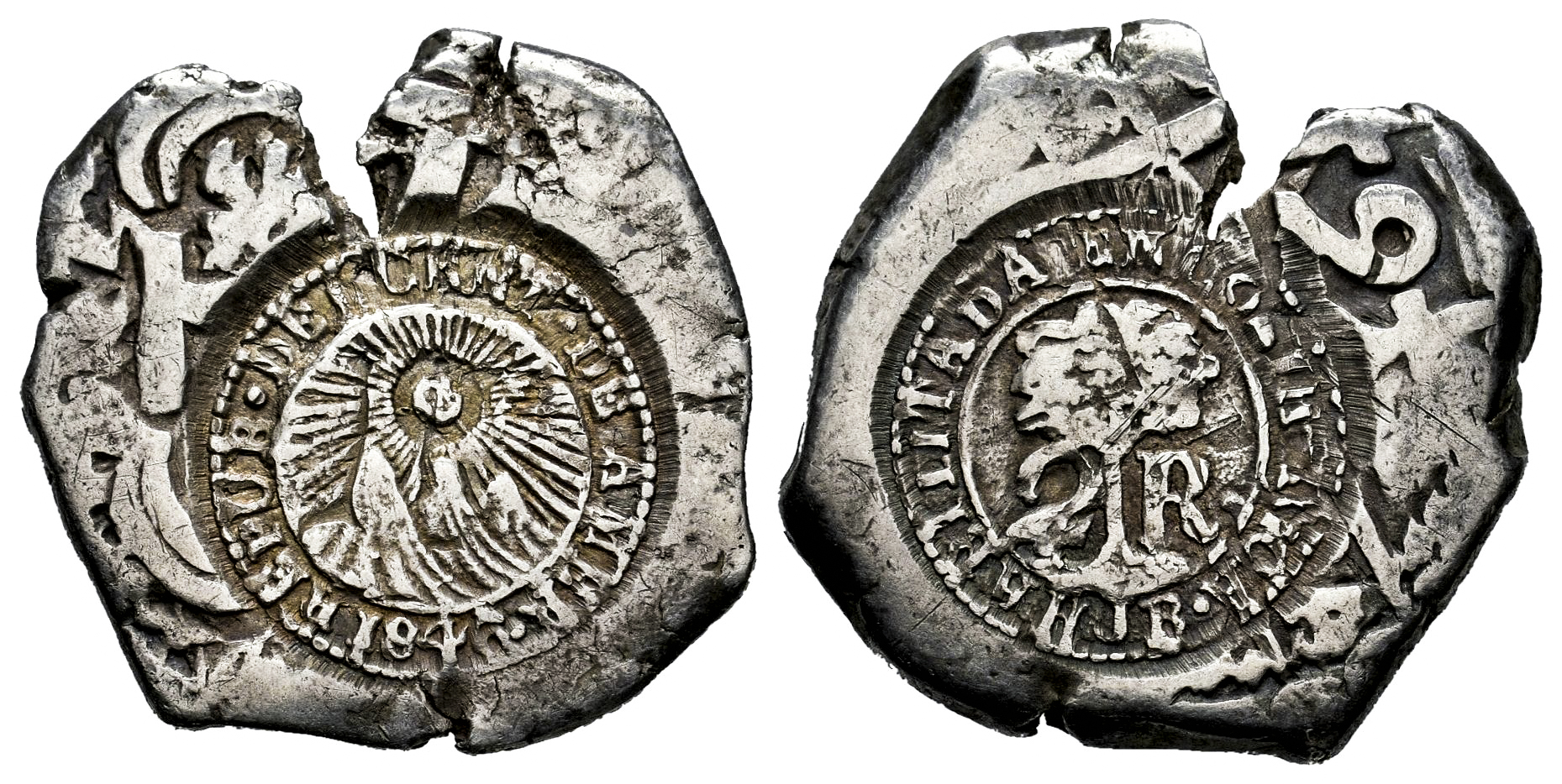 Costa Rica. 2 reales. 1846. San José. JB. (Km-54, Type V). Ag. 6,45 g. Countermark over 2 reales from Potosi. Scarce. VF. Est...300,00.