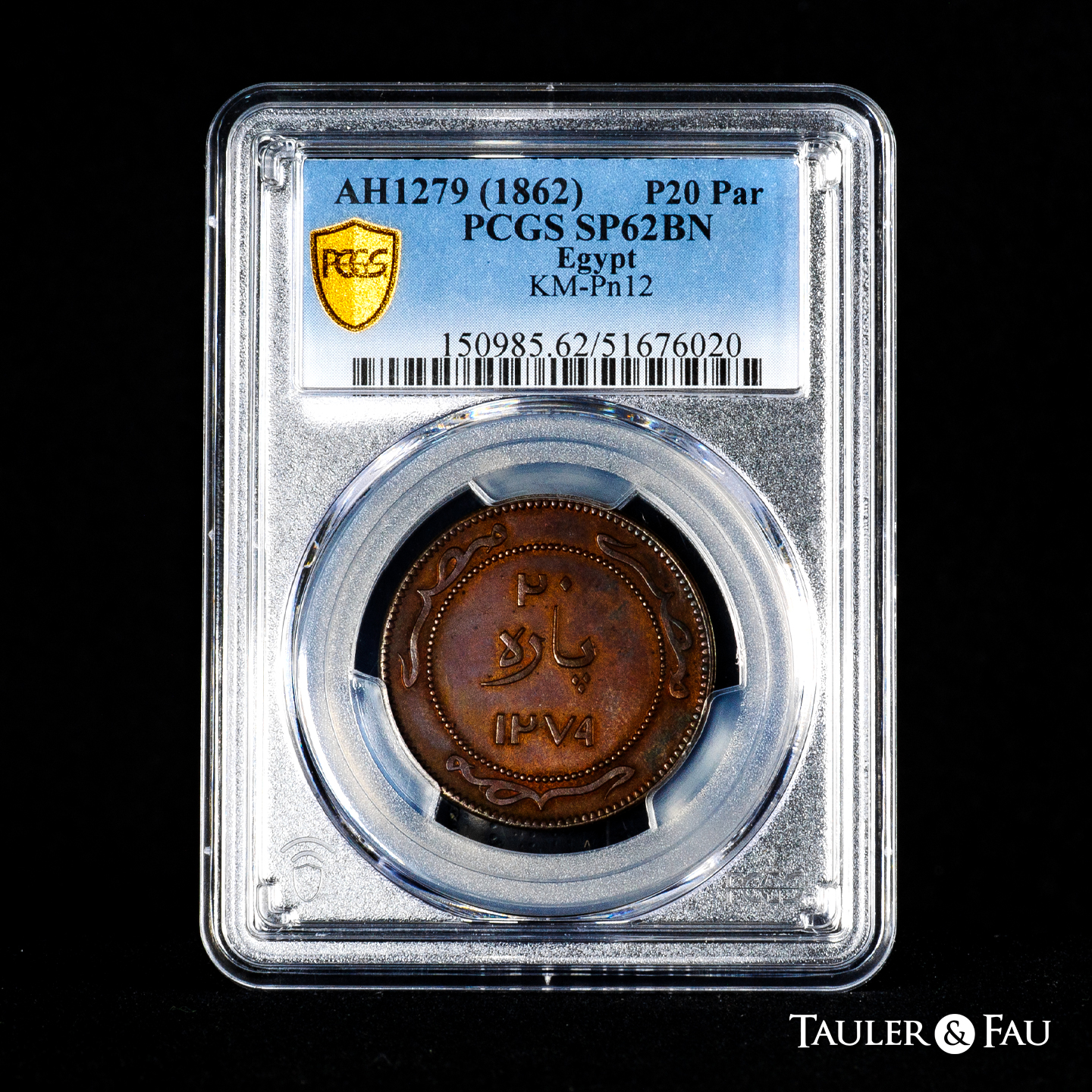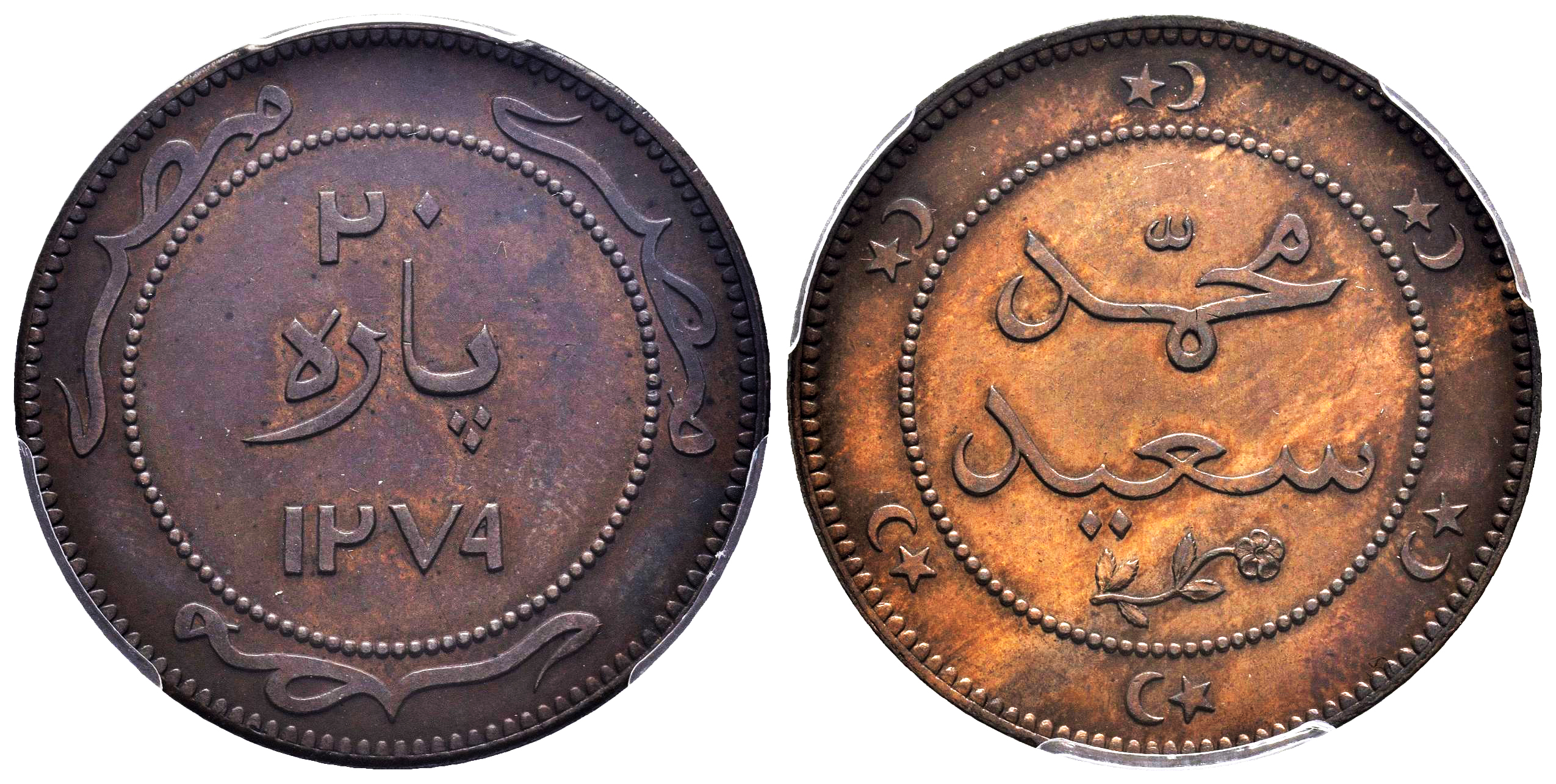 Egypt. Abdul Aziz. Copper pattern of 20 para. 1279 H (1862). Paris. (Km-Pn12). Ae. Very rare. Slabbed by PCGS as SP 62 BN. Est...700,00.