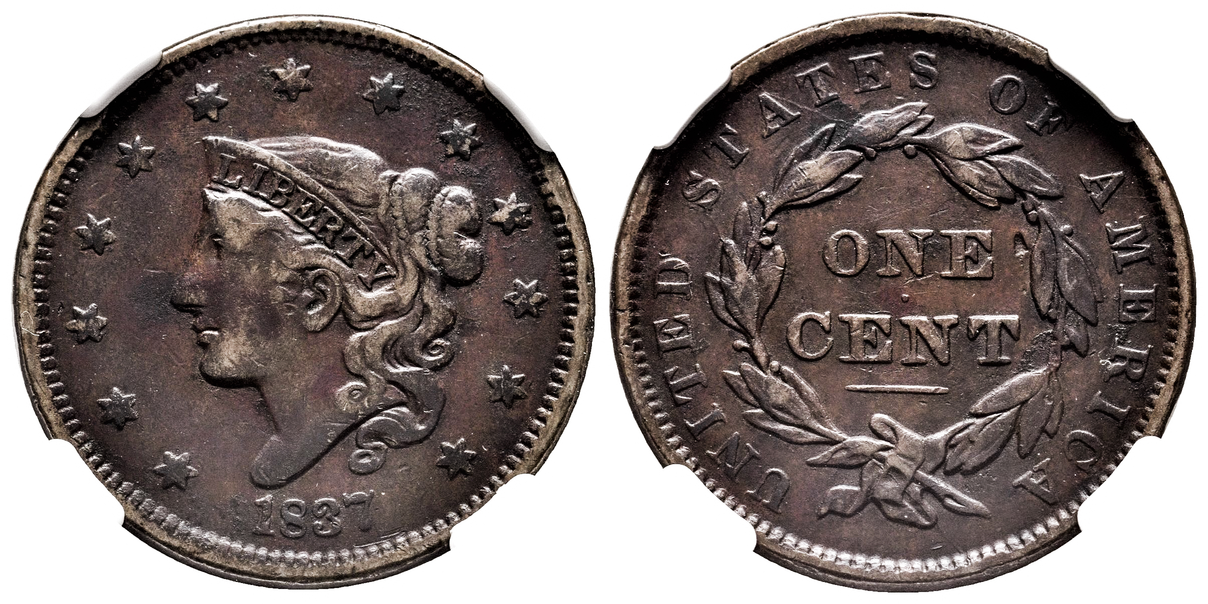 U.S. Coins. Braided Hair Cents. 1 cent. 1837. Philadelphia. (Km-45.2). Ae. Slabbed by NGC as VF Details. Environmental damage. NGC-VF. Est...70,00.