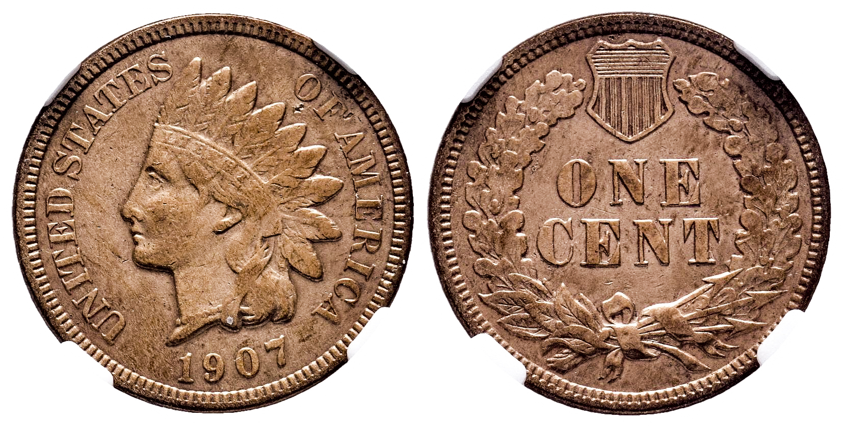 U.S. Coins. Indian Cents. 1 cent. 1907. Philadelphia. (Km-90a). Ae. Slabbed by NGC as XF details, cleaned. Est...50,00.
