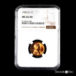 U.S. Coins. Lincoln Cents. 1 cent. 1956. Denver. D. (Km-132/A132). (Schön-130). Ae. Slabbed by NGC as MS 66 RB. Est...25,00.