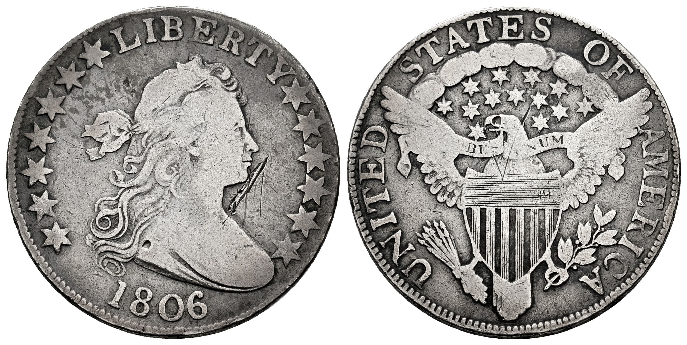 U.S. Coins. Draped Bust Half Dollars. Half dollar. 1806. Philadelphia. (Km-35). Ag. 13,00 g. Scratch on obverse. Scarce. Choice F. Est...320,00.