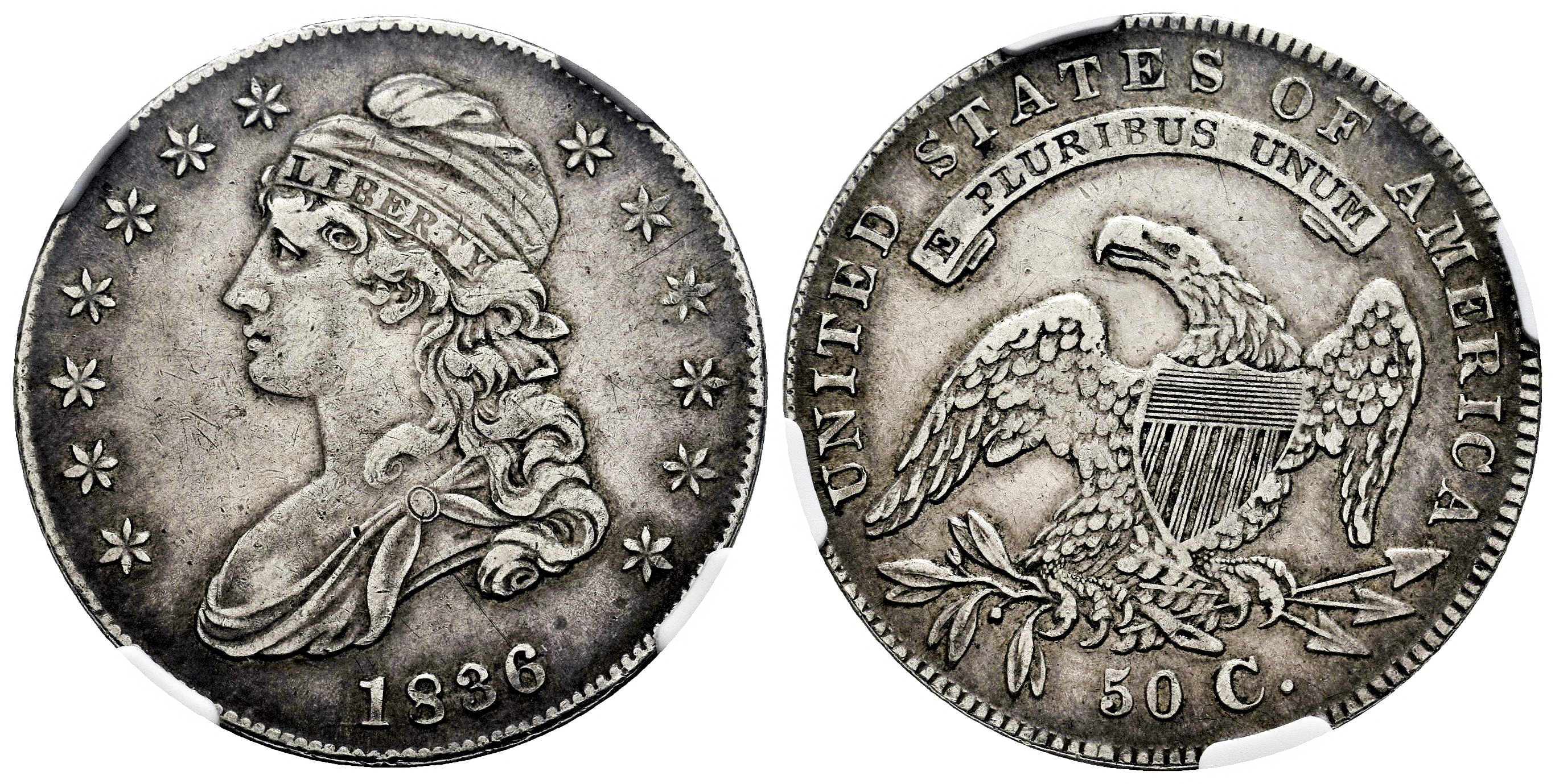 U.S. Coins. Capped Bust. Half dollar. 1836/1336. Philadelphia. (Km-37 var.). (Overton-108a). Ag. Slabbed by NGC as XF 45. A variety with the corrected date of 1836 over 1336, which was overlooked by NGC. Rare. Est...200,00.